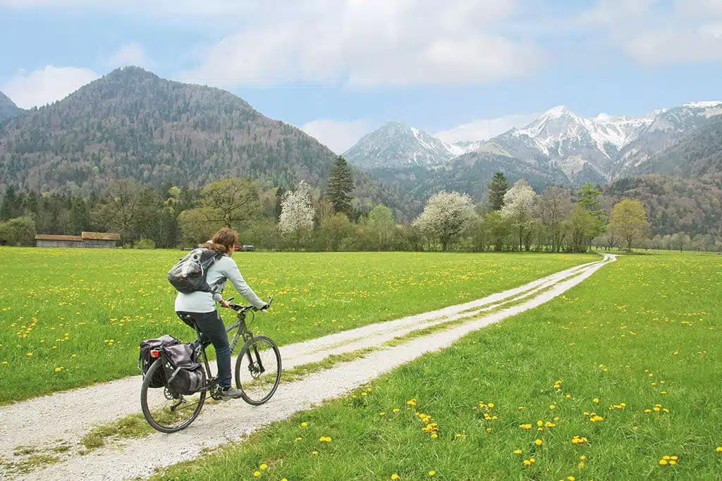 Besonders spannend im Frühling: Die Nähe zwischen Strandbars und verschneiten Bergen. Mit dem Rad kann man der Tiroler Achen vom Seegebiet aus bis tief in die Chiemgauer Alpen folgen. Der bequeme, mit wenigen Steigungen versehene und daher kinderfreundliche Achentalradweg und Teile des „Achen-Achters“ machen eine solche Radtour auch im Frühling möglich. Am Ende eines Chiemsee-Chiemgau-Aufenthaltes bietet sich der zu Fuß oder per Seilbahn erreichbare Gipfel des Hochfelln für einen Panoramablick über den Chiemsee und die Alpen an.
