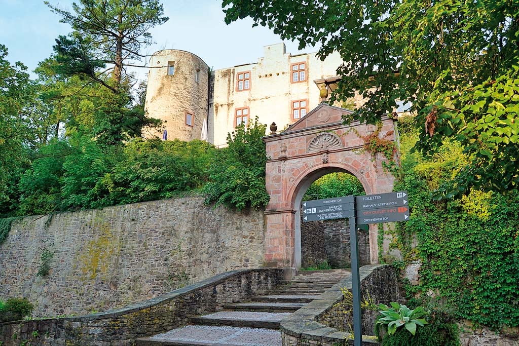 Tatsächlich wurde Bad Münstereifel erstmals 1299 „oppidum Monasterium in Eiflia“, also befestigter (Kloster-)Ort in der Eifel genannt. Von dieser Befestigung zeugen die vier großen Tore und einst 18 Wehrtürme der Stadtmauer, die außer dem Zentrum eine gewaltige Burganlage umschließt. Dieses Gemäuer, knapp 200 Meter vom Markt entfernt, befindet sich in privater Hand und beherbergt ein Restaurant sowie Luxuswohnungen. Seit dem 13. Jahrhundert hat sich in Bad Münstereifel also gar nicht so viel geändert.