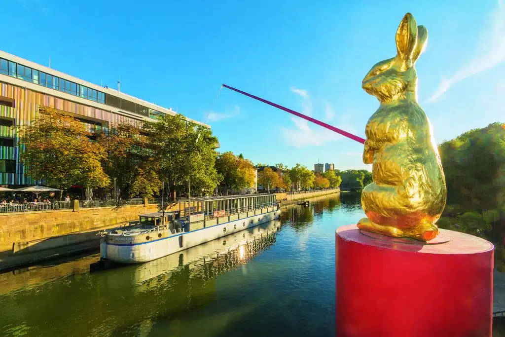 Und nun geht es an die Neckarpromenade. Ein echter Hingucker ist dort das knallrote, 2019 eingeweihte „One Man House“ von Thomas Schütte mit seinem riesigen Bullauge. Der Düsseldorfer Bildhauer hat hier ein echtes Wahrzeichen geschaffen. Es liegt inmitten des Flusses auf der Inselspitze. Im Gebäude unmittelbar daneben finden im Sommer regelmäßig Ausstellungen statt, die bis November zu sehen sind.
