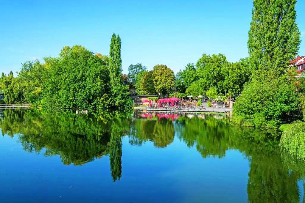 Von hier aus spazieren wir nordwärts weiter am Neckar-Seitenarm durch das BUGA-Gelände, das 2019 geschaffen wurde: Die Uferlandschaft wurde maritim neu gestaltet, mit Grünflächen und Seen, Wassertreppen, Gradierwerk, Sportstätten, Spielplätzen, Anlegern und Holzstegen, alles nur wenige Minuten von der Innenstadt entfernt. Am Neckarbogen gibt es heute eine großartige Mischung aus neuer Wohnarchitektur, Orten der Entspannung und zum Teil historischen Fabriken. Vor dem Backsteingebäude der „Alten Reederei“ kann man, direkt am Fluss, mit Flair speisen und einen hiesigen Lemberger oder Trollinger Wein genießen. Danach sind wir dann auch wieder schnell am Bahnhof oder in der Stadtmitte.