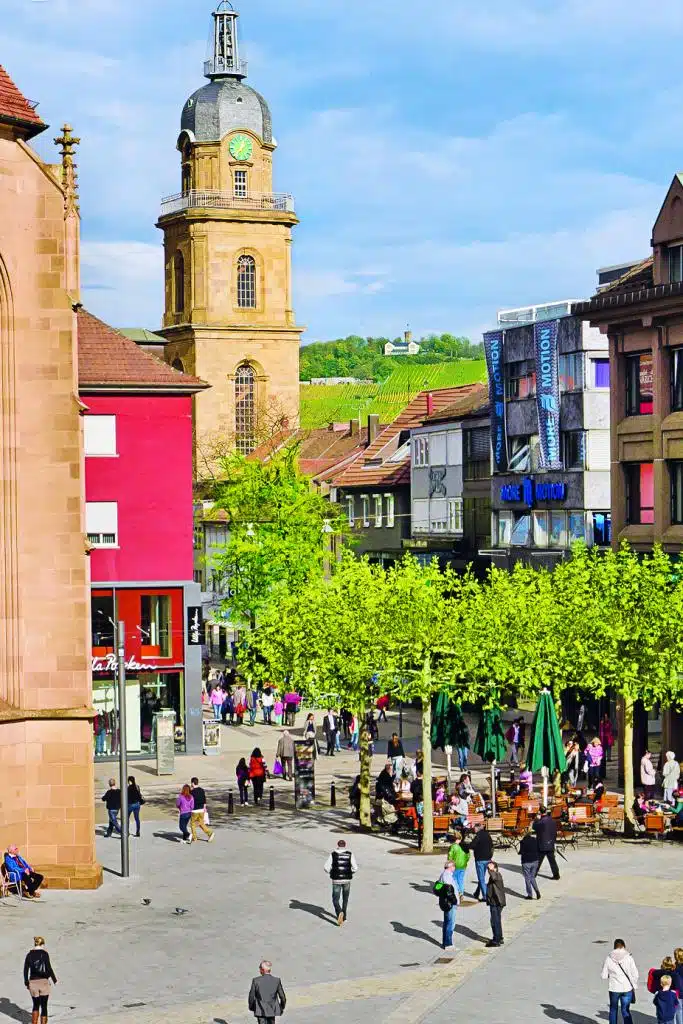 Wir beginnen unseren Spaziergang durch die Innenstadt am Marktplatz: Hier stehen das alte Rathaus mit seiner astronomischen „Kunstuhr“ aus dem 16. Jahrhundert und die Kilianskirche mit ihrem meisterlichen Altar von Hans Seyfer aus dem Jahr 1498 und dem kunsthistorisch herausragenden Renaissanceturm, den man auch besteigen kann. Zum historischen Deutschhof mit den städtischen Museen und dem Haus der Stadtgeschichte ist es von hier ganz nah.