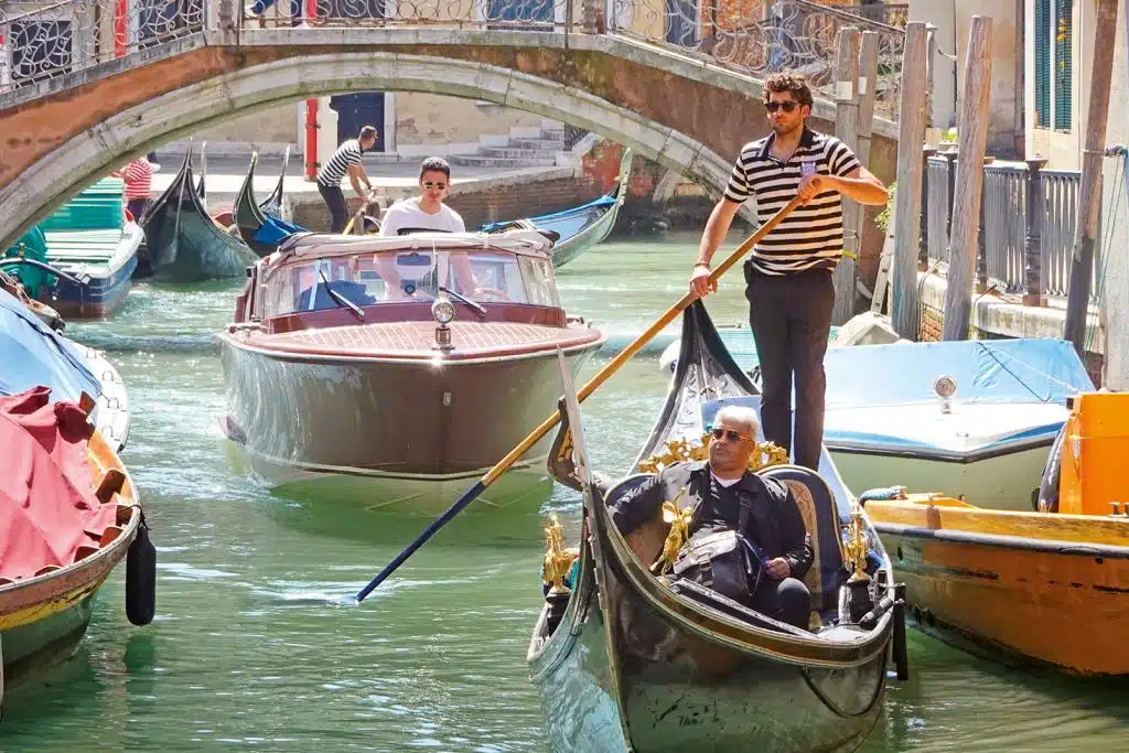 Schnell wird klar, dass hier keine hupenden Autos, Vespas und Motorräder wie in anderen Städten Italiens verkehren. Statt Straßen gibt es Kanäle. Und darauf bewegen sich Gondeln, Vaporetti (Wasserbusse), Wassertaxis, Ambulanzboote, Ausflugsboote, Sportboote, Fischerboote, Müllschiffe und Lastkähne mit Bauschutt, Nahrungsmitteln, Bettwäsche und Postpaketen. Auch wagemutige Touristen auf Kajaks gesellen sich hinzu, die auf Bugwellen schaukelnd versuchen, das Gleichgewicht zu halten. Besonders viele Wasserfahrzeuge sieht man auf dem berühmten Canal Grande, einer knapp vier Kilometer langen Hauptwasserstraße, die sich schlangenförmig durch die Lagunenstadt windet. Ruhiger geht es da auf den Seitenkanälen zu. Es sei denn, aus einer vorbeifahrenden Gondel ertönt „O sole mio!“.