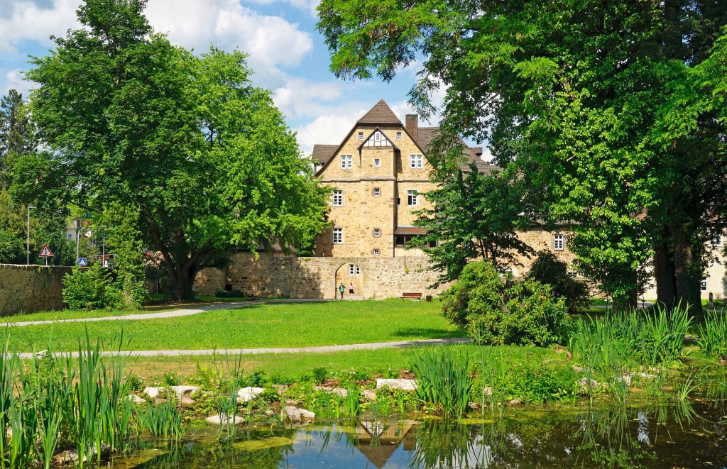 Wer westlich vom Schloss einen kleinen Wirtschaftshof passiert, gelangt in den Schlosspark mit altem Baumbestand und dem Teich. Links ist ein Rest der alten Stadtmauer sichtbar, den ein Rundturm überragt, erbaut um 1400. Tipp: In den hessischen Sommerferien verwandelt sich der Schlossgarten zum Biergarten mit Kultur- und Musikprogramm. Gegenüber vom Schloss steht der ehemalige Marstall, 1577 von Landgraf Wilhelm IV von Hessen-Kassel erbaut. Im Dreißigjährigen Krieg nahm das Gebäude 50 bis 60 Pferde auf. Farbig abgesetzt trägt es das große Hessische Staatswappen von 1577.