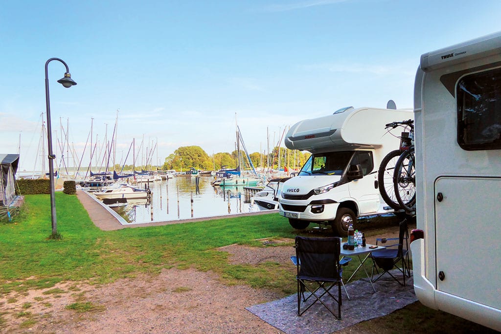 Den Rundgang in der Tourist-Information zu starten lohnt sich: Hier gibt es alle nötigen Tipps. Das Haus des Gastes, in dem die Info residiert, ist vom Campingplatz aus in 2,5 Kilometern erreicht, vom Stellplatz sind es gerade mal 1.200 Meter. Beides ist zu Fuß oder mit dem Fahrrad gut machbar. Tipp: So oder so führt der Weg über die Promenade an den Restaurants Seestern und Seglerheim vorbei. Wer abends essen möchte, am besten draußen mit Blick auf Hafen, Boote und Wasser, sollte rechtzeitig einen Platz reservieren – was sich auf dem Hinweg in die Stadt geradezu anbietet.