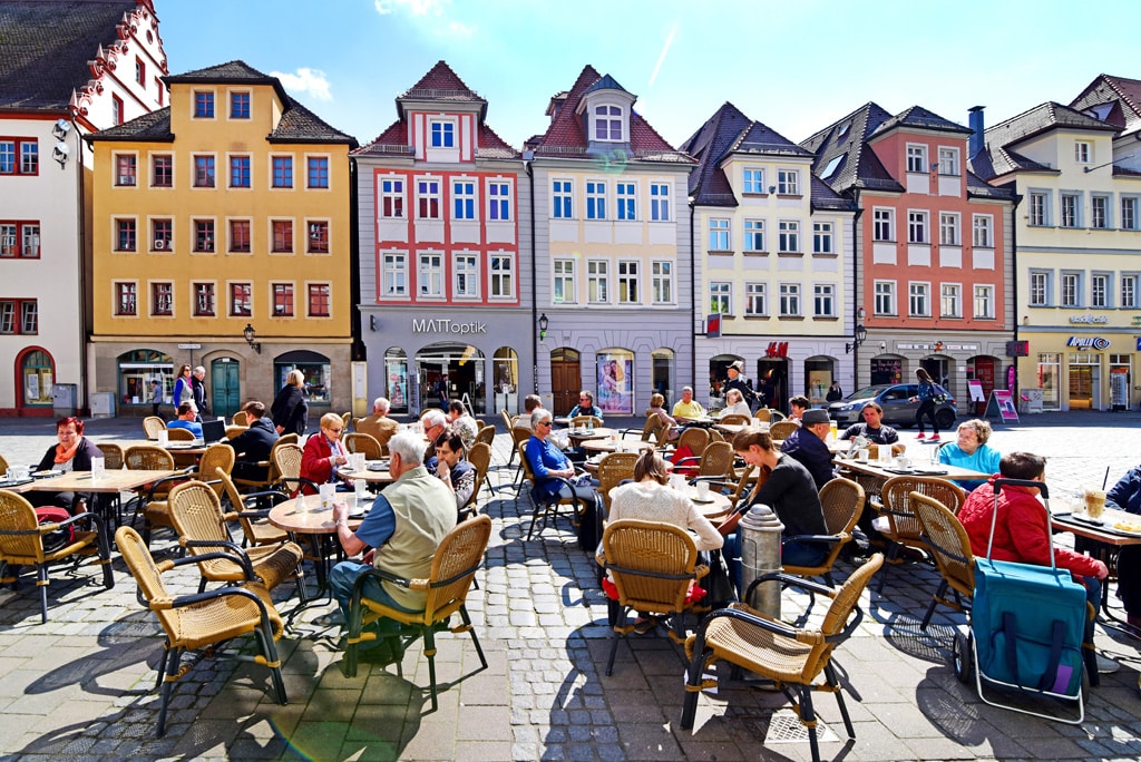 Hier, auf dem Johann-Sebastian-Bach- und dem benachbarten Martin-Luther- Platz sitzen Menschen gern in Straßencafés. Neben ihnen plätschert der Markgraf- Georg-Brunnen, und sie sind umrahmt von schmucken Giebelhäusern, dem Rathaus und der für Ansbach wichtigen Kirche St. Gumbertus.