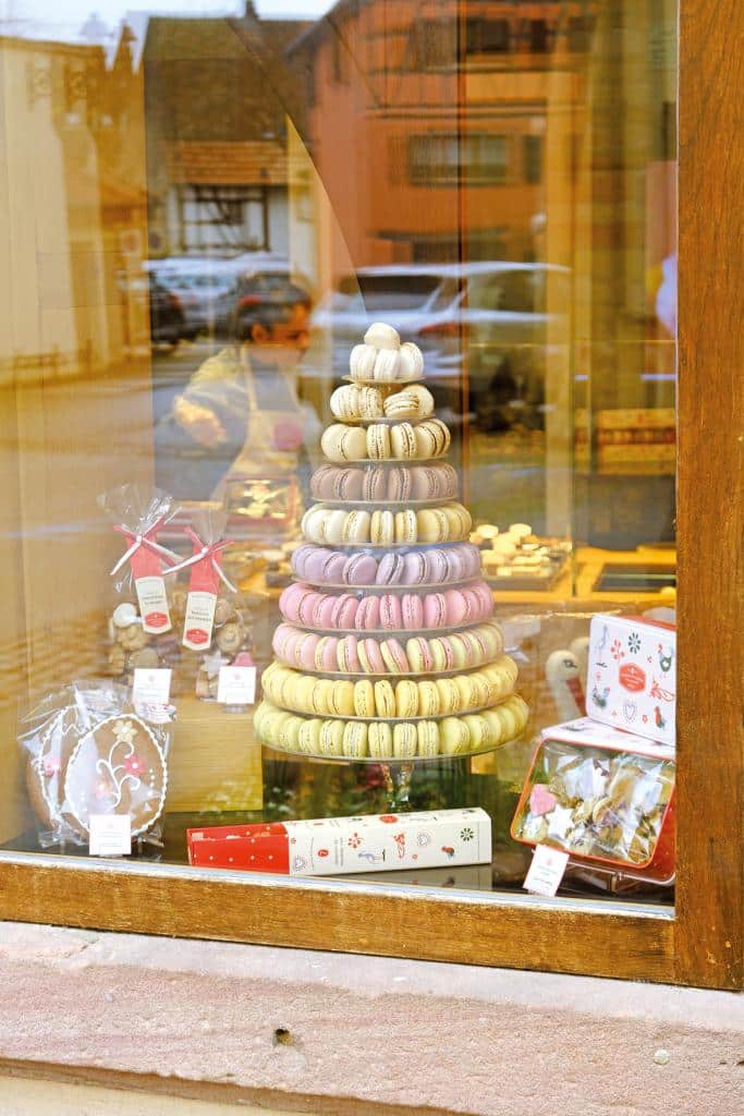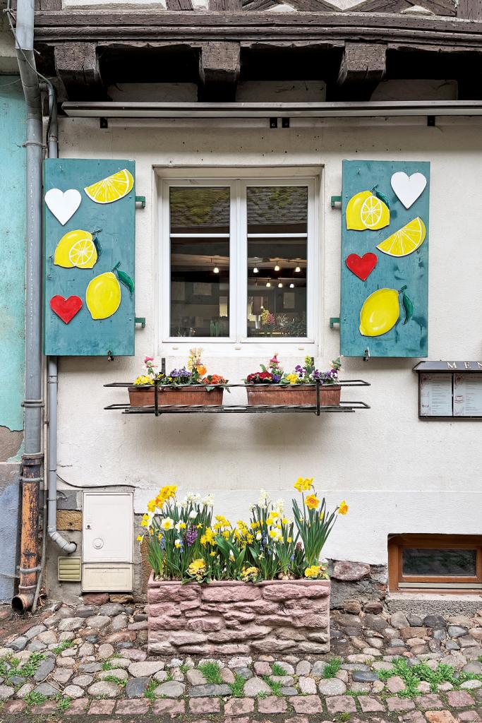 An einem der Häuser zieren Zitronen und Herzen den hölzernen Fensterladen. Die Teestube Le Thé au Citron lockt mit Erfrischungen, Kaffee, Törtchen, Gebäck und einer großen Auswahl an Teesorten. In der Vitrine liegen auf einem polierten Silbertablett Kekse mit Schokoladenstückchen und elsässischen Bretzeln dekoriert – eine süß-salzige Versuchung. Das Knabbergebäck in Brezelform wird ansonsten traditionell in den Bars und Restaurants zum Aperitif gereicht.