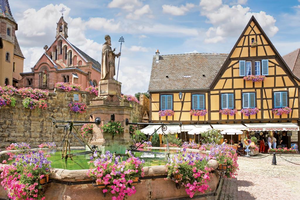 Urig und bunt: Eguisheim verzaubert mit Fachwerkfassaden und Kopfsteinpflaster. Die Altstadt inspirierte einst Disneys Filmemacher. Ihren Charme bewahrt sie bis heute – Camper übernachten mit Blick auf die Weinberge.