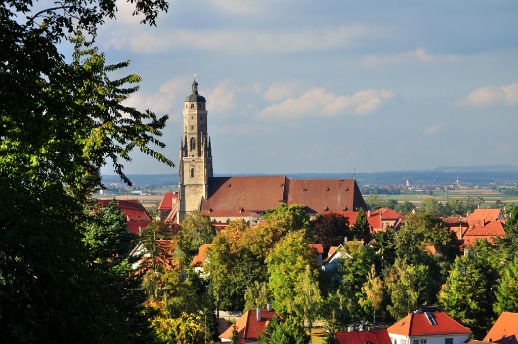Von dort sind es zu Fuß gerade mal 800 Meter bis zum Marktplatz im Zentrum Nördlingens. Dabei lohnt es sich, diesen direkten Weg zunächst nicht zu nehmen: Die Runde auf Deutschlands einziger vollständig erhaltener und komplett begehbaren Stadtmauer ist nur 2,7 Kilometer lang und verspricht einen guten Überblick.