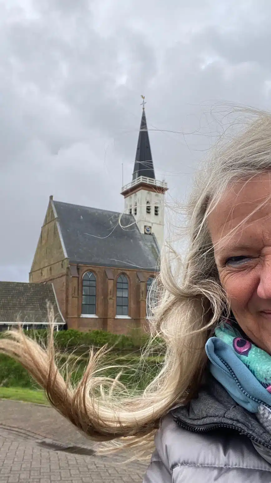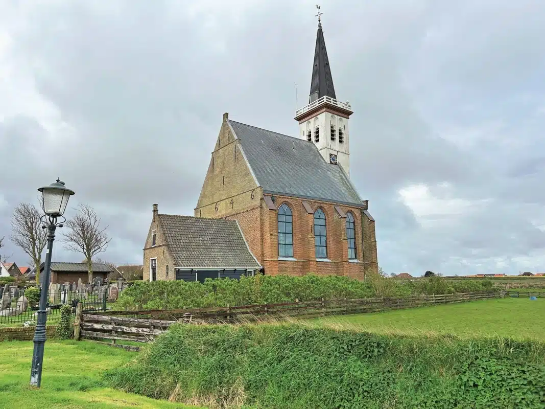 Das südlichste Dorf der Insel ist Den Hoorn mit gemütlichen kleinen Straßen, in denen viele Künstler wohnen. Die schöne Dorfkirche stand früher mitten im Dorf, die Häuser rundum wurden aber verlassen und inzwischen abgerissen, so dass sie inzwischen frei und sehr fotogen in der Landschaft steht. Der Turm steht ein wenig schief und hängt nach Südwesten. „Absichtlich“, erklärt unser Guide, „da der Wind immer von Südwesten weht.“