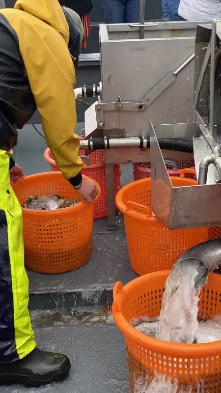 In einem großen Bottich kocht indes schon Wasser für das große Krabbenessen, das der Demonstration der aufgefischten Meerestiere folgt. Aus den vollen Netzen fällt der Fang zunächst in eine Sortieranlage. Fische werden von den Krebstieren getrennt. Ein brummig dreinschauender Seemann (das gehört wohl zum Image) zieht immer wieder besonders schöne Exemplare aus der Auffangwanne und hält sie den Gästen ganz dicht unter die Nase oder direkt vors Display eines auf ihn gerichteten Handys.