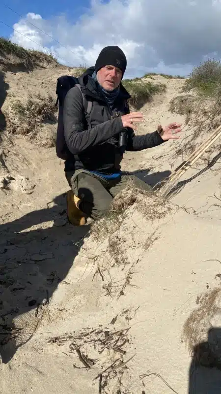 Das Nebeneinander von Süß- und Salzwasser macht die Besonderheit dieses Landstrichs aus. Im Hochsommer wird De Slufter vom blühenden Strandflieder lila gefärbt. Diese Salzwiesenpflanze wächst an Stellen, die nicht täglich vom Meerwasser überflutet werden. Ihr Nektar lockt Bienen und Schmetterlinge an. Marcel zeigt uns auch das Zusammenspiel von Bienen und Hasen. Bienen nützen die Gänge der Hasen für den Nestbau. Es wurden jüngst sogar extra Hasen ausgesetzt, um mehr Schlupflöcher für Bienen zu schaffen.