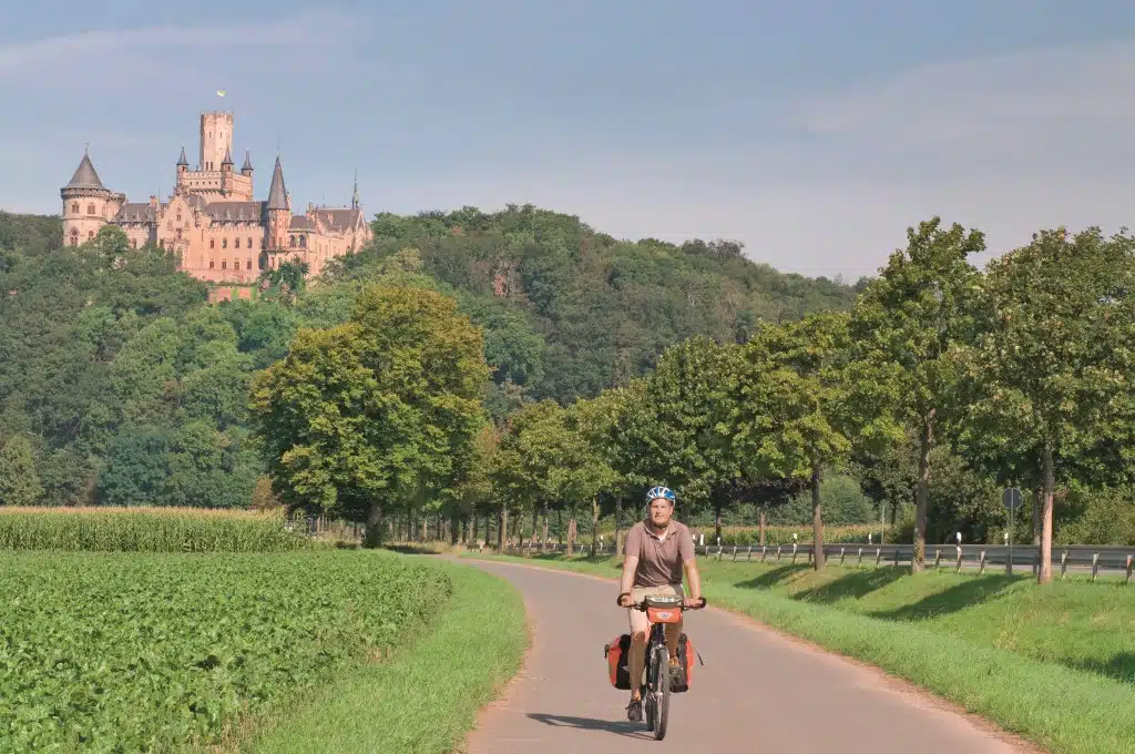 Mit dem Rad führt der Weg vom Hildesheimer Stellplatz zum Schloss durch grüne Weite. Schon aus der Ferne erhebt sich die ehemalige Sommerresidenz am Berghang, als würde sie gerade aus dem Dornröschenschlaf erwachen. Doch hier wächst kein tausendjähriger Rosenstock.
