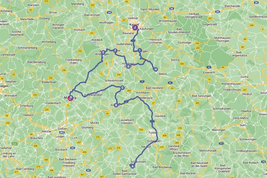 An einem trüben Herbstmorgen stehen wir hoch über dem Städtchen Homberg an der Efze. Ein Schwarm Krähen umkrächzt die Burgruine. Wahrscheinlich war es genau so ein Augenblick, der vor 200 Jahren die Brüder Jacob und Wilhelm Grimm, denen die Gegend lange Zeit Heimat war, zur Geschichte von den Sieben Raben inspirierte. Ihre Märchen begegnen uns hier auf Schritt und Tritt. In Form von Plastiken, auf Märchenwegen, in Märchenhäusern und Grimm-Museen. Unsere mehr als 400 Kilometer lange Route folgt der Märchenstraße, die streckenweise mit der Deutschen Fachwerkstraße identisch ist. Es geht entlang der schönen Täler von Kinzig, Schwalm, Lahn, Eder und Fulda, wo Radwege am Flusslauf zum entspannten Radeln einladen. Schöne Wanderwege gibt es allerorten.