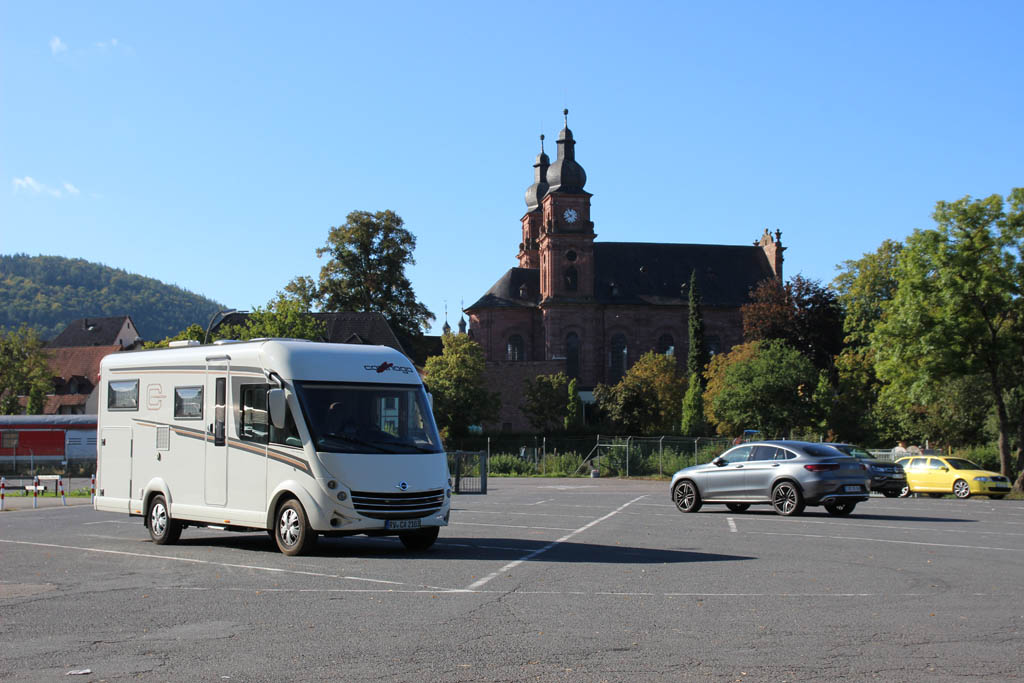 Nach kurvigen Kilometern auf der Landstraße passieren die Tester den hundefreundlichen Campingplatz in Kirchzell und erreichen nach wenigen Kilometern die Benediktinerabtei Amorbach. So schön und einladend sich die Abtei samt prächtiger Klosterkirche präsentiert, so trist ist die Atmosphäre des Stellplatzes. Keine Serviceeinrichtungen, nur Parkplatzflair. Dafür entschädigt die nahe Lage zur Abtei, die sich von hier aus fußläufig erkunden lässt.