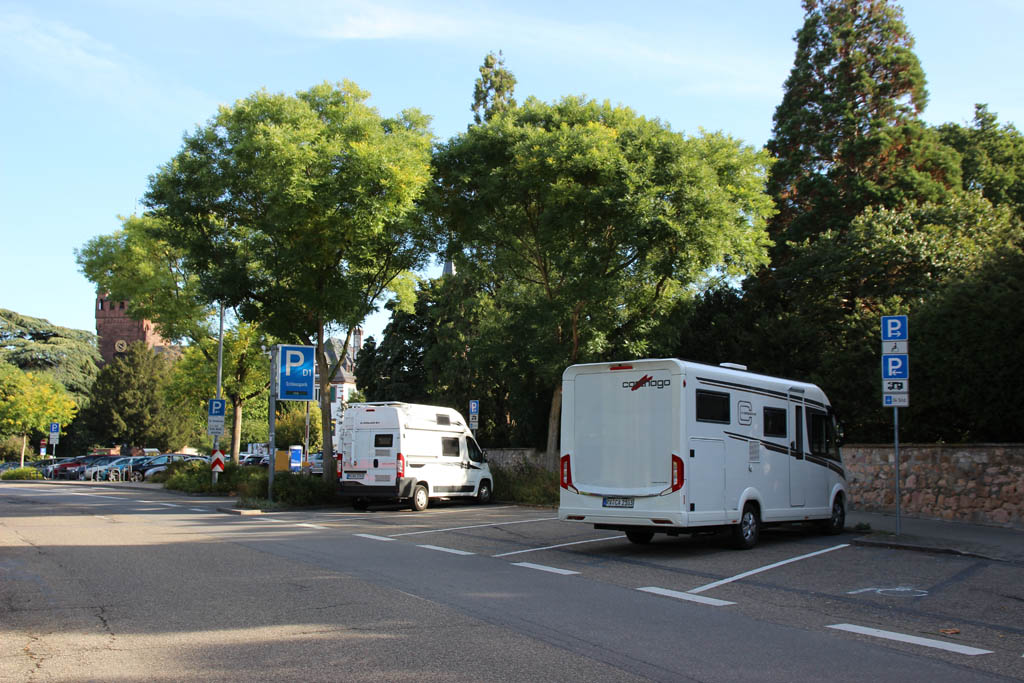 Weiter auf der Bergstraße und der B3 entlang passiert der Integrierte von Carthago nach kurzer Zeit das Ortsschild Weinheim. Marktplatz und Gerberviertel der Zwei- Burgen-Stadt versprühen auch im Winter ein besonderes Flair. Ebenso besonders wirkt das Schloss, das sich mit seinem weitläufigen Schlosspark und den hohen Mammutbäumen von seiner herrschaftlichen Seite präsentiert. Ganz anders der Stellplatz. Er ist quasi eine Parkbucht an der Straße und daher wenig einladend und erst recht nicht herrschaftlich. Dafür überzeugt seine Lage direkt am Schlosspark – und der Preis.