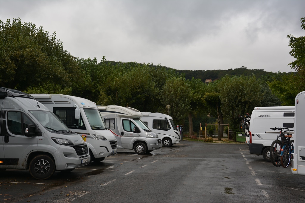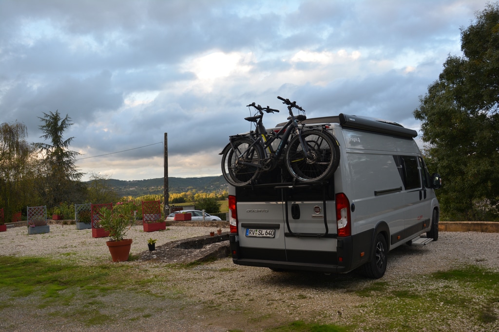 Der schlichte Stellplatz in St.-Cyprien liegt zentral und mit schöner Aussicht auf die Altstadt auf einem Parkplatz. Es gibt Strom, Wasser und Entsorgungsmöglichkeiten. Für eine Nacht ok, wir entscheiden uns aber für den auf einer Anhöhe gelegenen Stellplatz „Les Terrasses de Merculot“ im Örtchen Marnac. Der Platz ist nur ein paar Minuten entfernt auf der anderen Flussseite. Die Aussicht ist fantastisch, alles ist liebevoll angelegt mit geschotterten Stellflächen, Blumen und Sitzmöglichkeiten. Die Gastgeber sind freundlich und unkompliziert. Den Wecker ersetzt der etwas heisere Hahn, der schon um vier Uhr morgens der Meinung war, es sei Zeit zum Aufstehen.