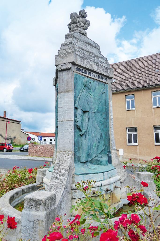 Dessen Sockel dient als Brunnen. Unterhalb des Heiligen Georgs, des Schutzheiligen der Stadt – siehe Relief am Rathaus –, sind Bronzebilder eingelassen. Die vordere Platte zeigt Martin Luther als 13-Jährigen mit dem Text „Hinaus in die Welt“. Die zweite Bronze stellt den Reformator bei seinem Thesenanschlag in Wittenberg dar mit dem Text „Hinein in den Kampf“. Das dritte Relief widmet sich ihm vor dem Reichstag in Worms: „Hindurch zum Sieg“.