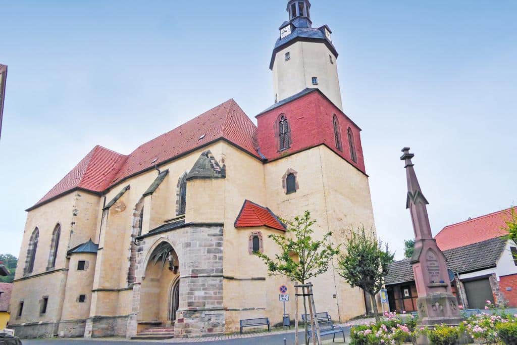 Seine ersten Schritte hin zum Glauben machte er in der St.-Georg-Kirche: Die Stadtkirche von Mannsfeld wurde ab 1397 erbaut. Martin Luther diente in dem Gotteshaus als Ministrant. Evangelisch gab es noch nicht. Als Erinnerung an den späteren Reformator hängt ein Ganzkörperporträt Luthers von 1540 aus der Cranach-Werkstatt – womöglich mehr bewundert als die Schnitzaltäre aus dem späten 15. Jahrhundert, eine Empore mit 49 Bildtafeln und der spätgotische Taufstein.