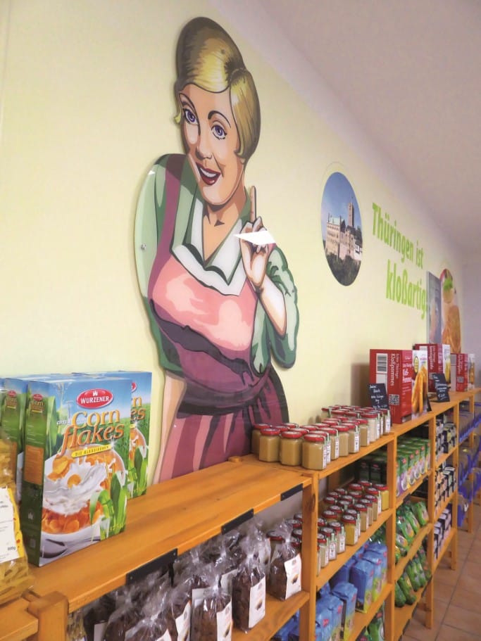 Niemand kommt zunächst an dem „kloßartigen Erlebniseinkauf für die ganze Familie“ vorbei, wie das Versprechen für den Werksverkauf lautet. Hier finden sich in Regalen und Kühltruhen Produkte, die es schon zu DDR-Zeiten gab. Puffreis und Kalter Hund, Halloren- Kugeln und Hexen-Eis, Deutscher Mais am Stiel und geschälter Spargel. Sogar auf „Bückware“, also Artikel, die einst nur unter der Ladentheke gehandelt wurden, verweist ein Schild. Kurz: Ostalgie lebt.