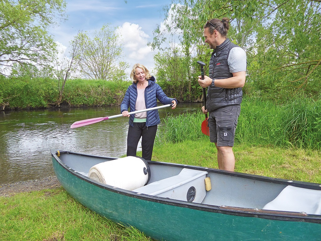 Schwäne und Enten zeigen ihrem Nachwuchs die Nahrungsquellen im Wasser, Rote Milane und Bussarde kreisen über den weiten Feldern neben dem Fluss. Der schlängelt sich durch die Flur wie durch eine andere Welt. Kein Auto ist zu hören, und Anzeichen von Zivilisation tauchen erst mit der Bahnbrücke unweit von Wedderstedt auf. Die überspannt die Bode in weiten Bögen. Seichte Stellen machen mit gekräuseltem Wasser auf sich aufmerksam. Sie gilt es zu umschiffen. Sonst bleibt sogar das flach laufende Kanu hängen und zwingt zum Ausstieg ins kühle Nass. Das ist nicht weiter schlimm, allenfalls die Schuhe sind nass. Wasser- und wetterfest sollte die Kleidung sein. Empfehlenswert sind Schwimmwesten – zumindest für Ungeübte. Wertsachen und Proviant sind in einem verschließbaren Fass verstaut.
