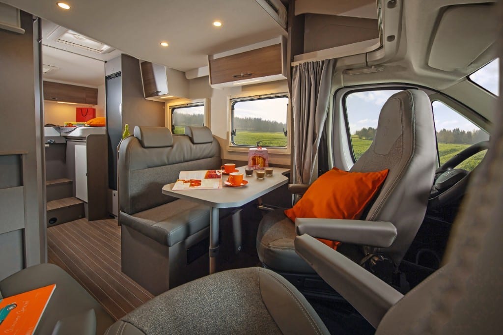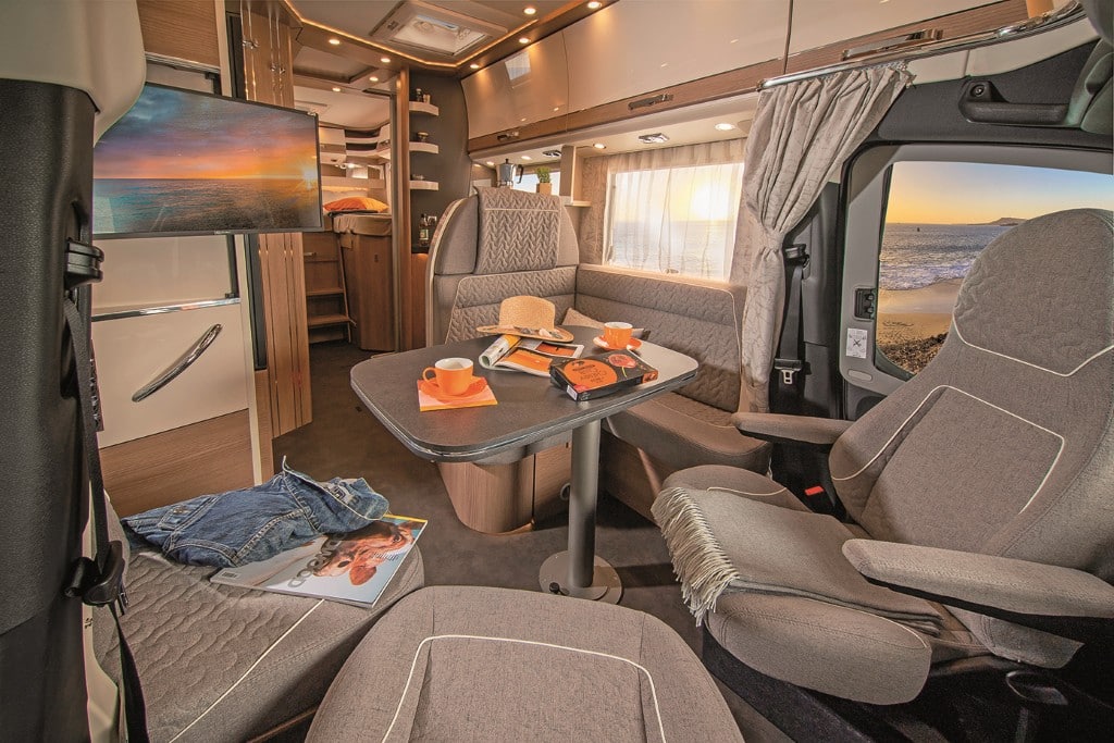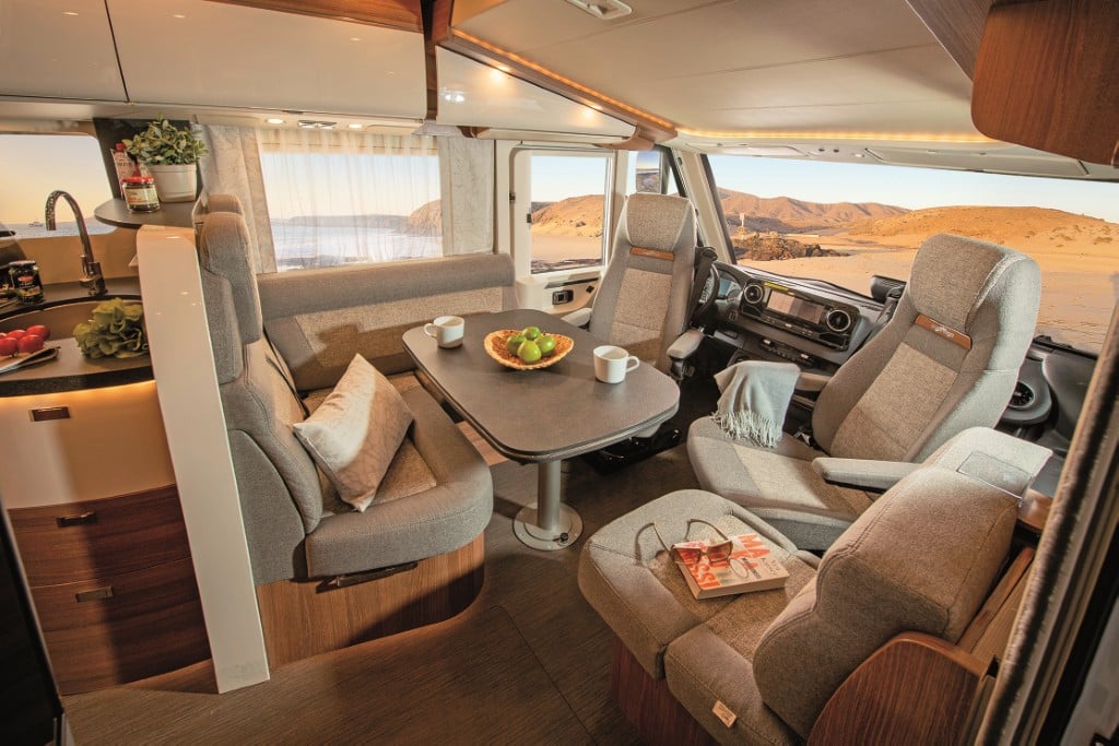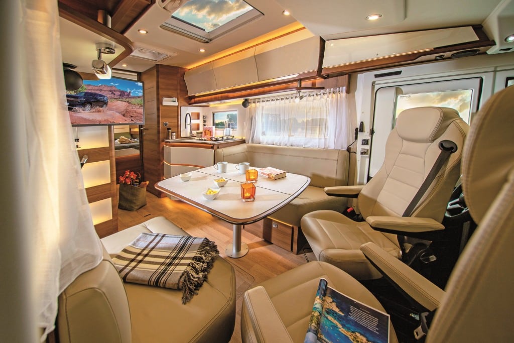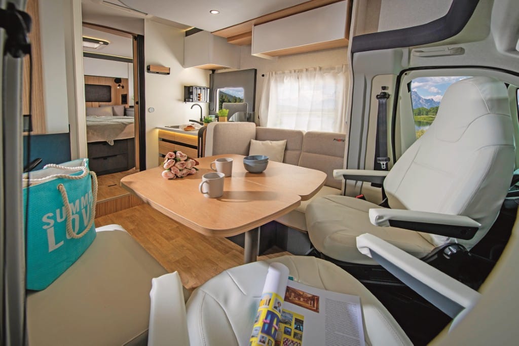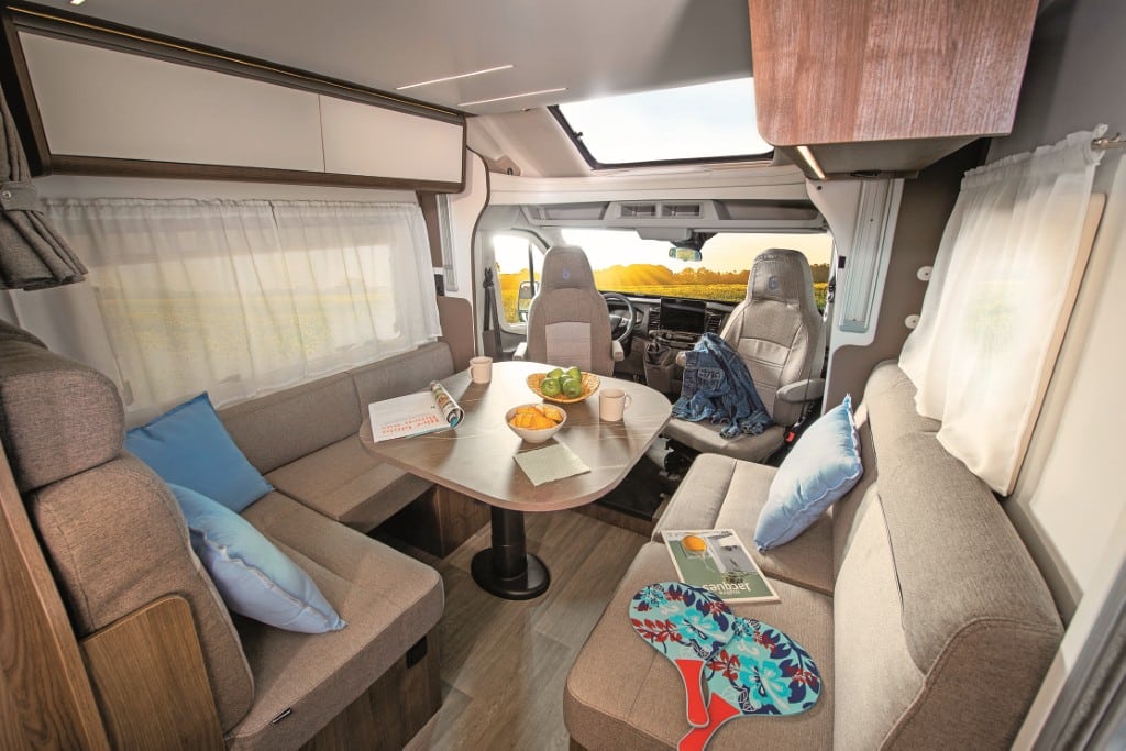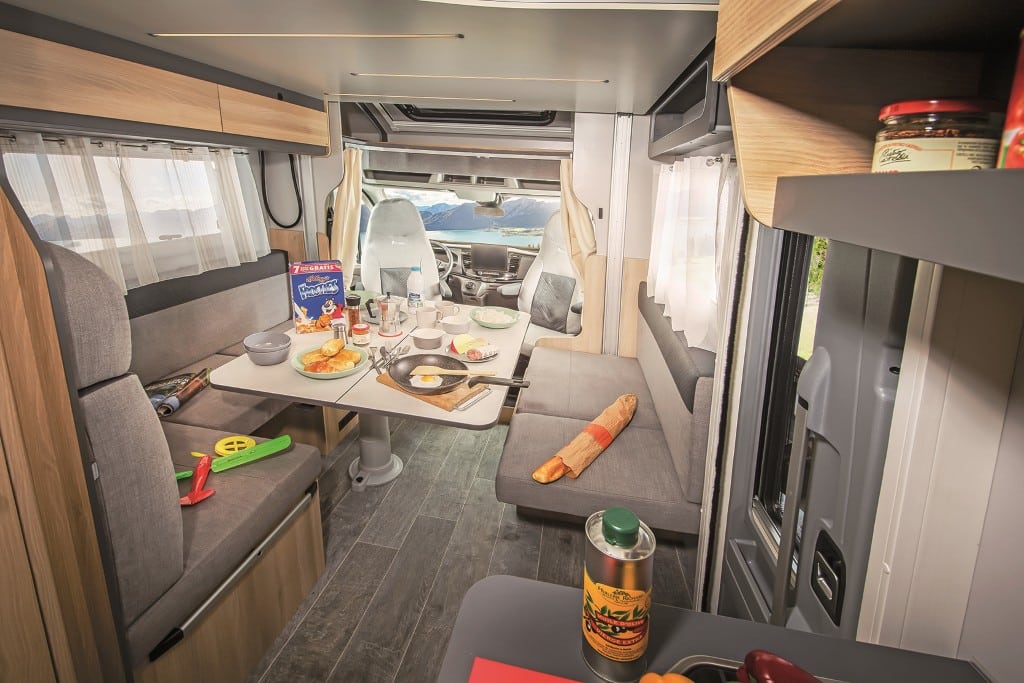 Das Mobiliar des 7,16 Meter langen und 227 Zentimeter breiten Teilintegrierten ist elegant und solide gefertigt, die Serienausstattung – etwa mit Fahrerhaus-Klimaanlage und Rahmenfenstern – sehr gut. Der beheizte Doppelboden nimmt die Versorgungstank frostsicher auf sowie zusätzliches Gepäck über Ladeluken im Wohnraumboden.