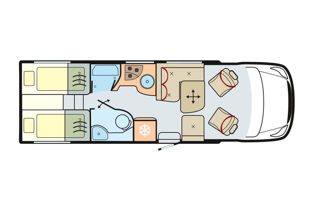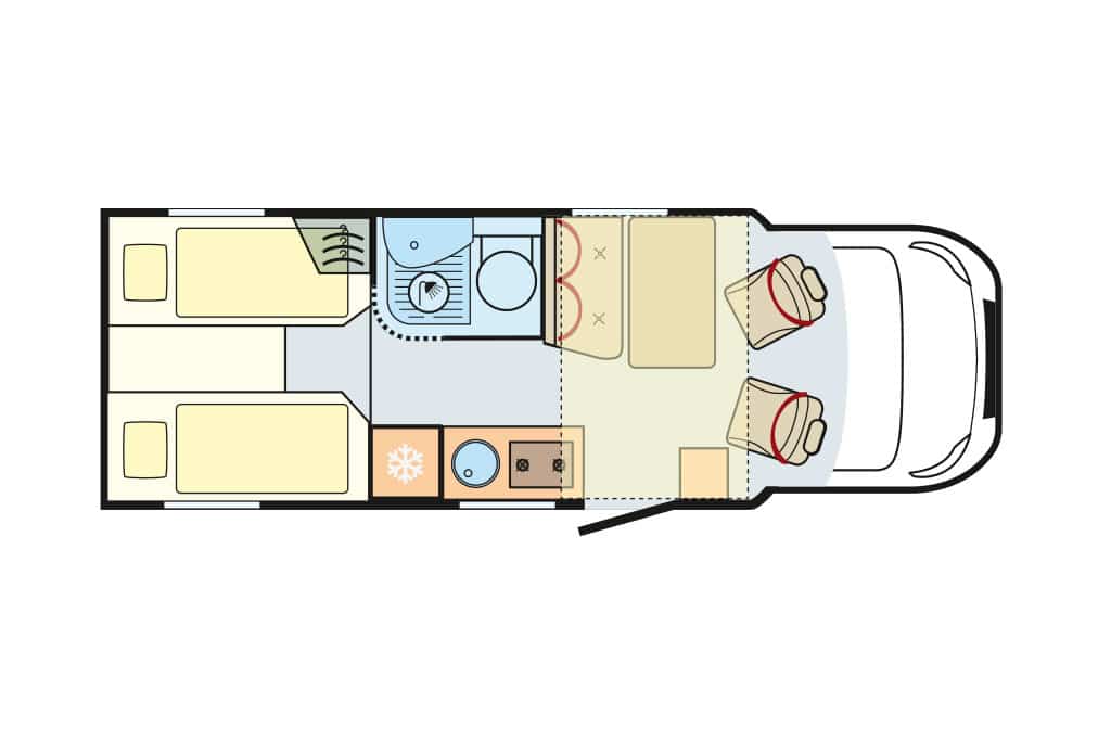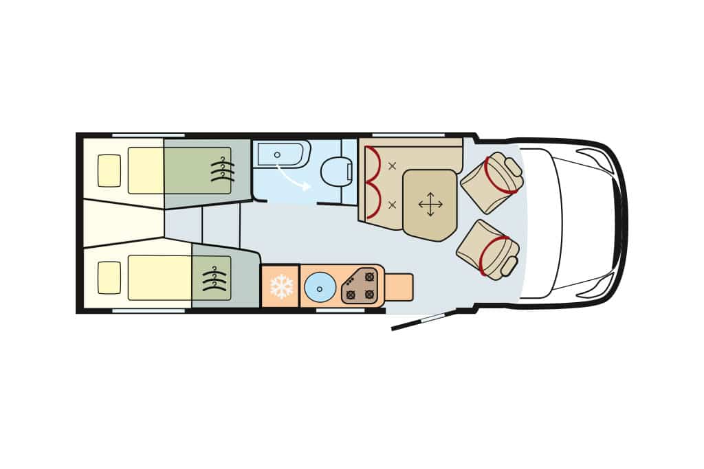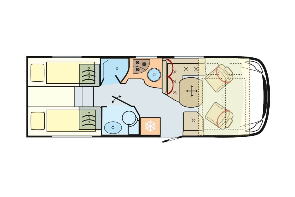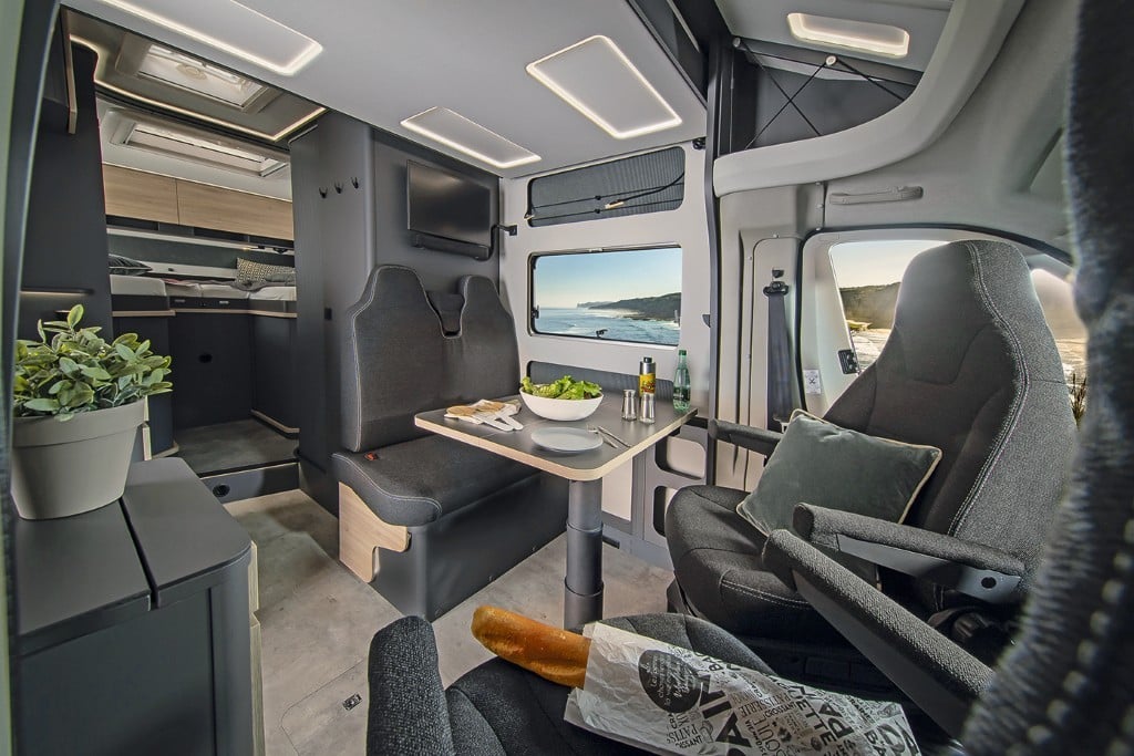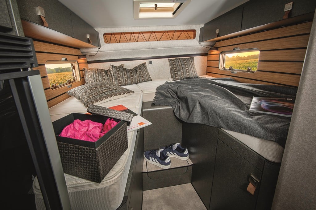 Die Raumaufteilung setzt sich aus Gegensitzgruppe, hochgesetzten Einzelbetten mit Garage darunter, Längsküche und Schwenkbad zusammen – ideal für zwei Personen. Der Abwassertank ist ab Werk isoliert und beheizt. 300-Ah-Lithium-Batterie und 120-Ampere-Ladegerät sind Serie. Die Zuladekapazität fällt mit 188 Kilogramm für zwei und mit 103 Kilogramm für vier Camper praxisgerecht aus. Der Grundpreis von 156.280 Euro erscheint angemessen.