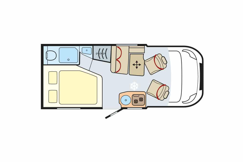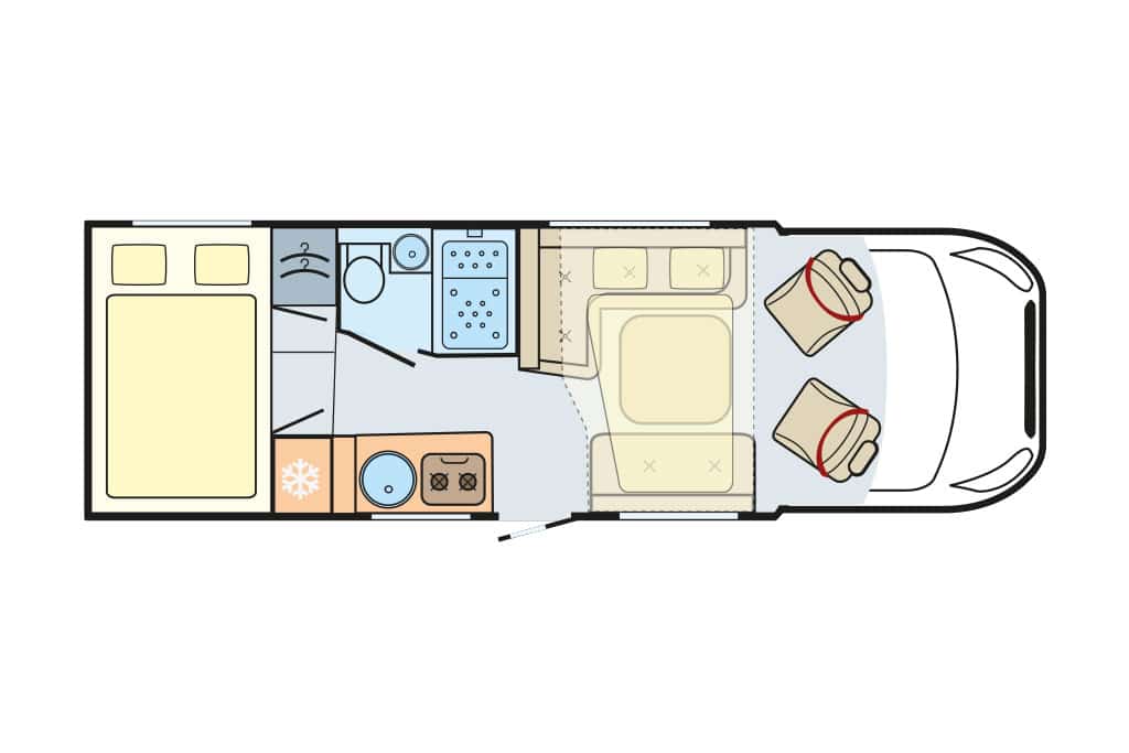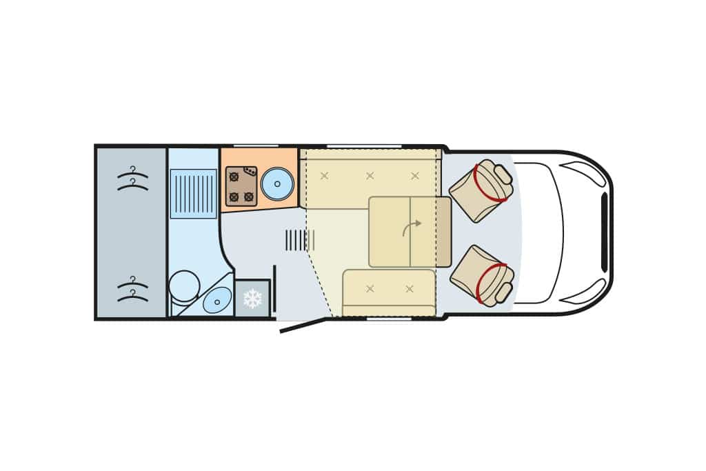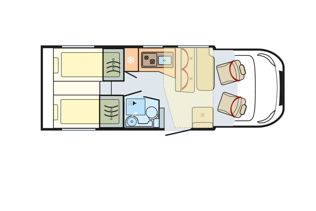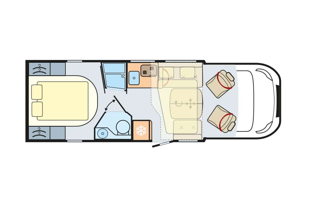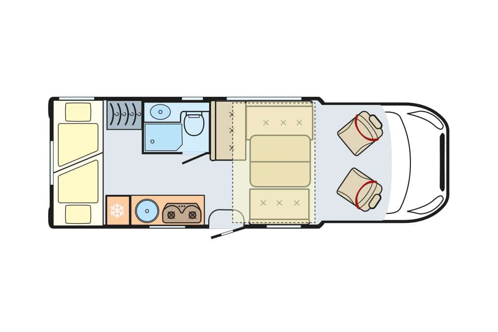 Die Raumaufteilung setzt sich aus Gegensitzgruppe, hochgesetzten Einzelbetten mit Garage darunter, Längsküche und Schwenkbad zusammen – ideal für zwei Personen. Der Abwassertank ist ab Werk isoliert und beheizt. 300-Ah-Lithium-Batterie und 120-Ampere-Ladegerät sind Serie. Die Zuladekapazität fällt mit 188 Kilogramm für zwei und mit 103 Kilogramm für vier Camper praxisgerecht aus. Der Grundpreis von 156.280 Euro erscheint angemessen.