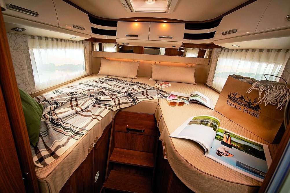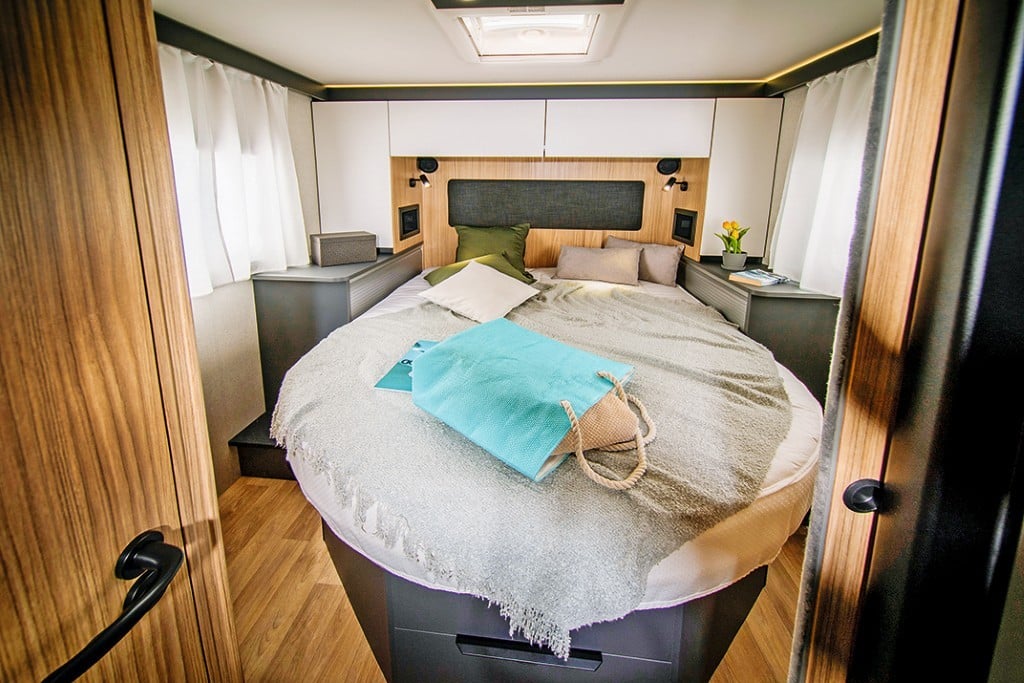 Interessant und elegant geformte, akkurat eingepasste Möbelklappen, ein großes Queensbett und stabile Möbel zeigen, in welcher Liga der Hersteller mit dem Distinction spielt. Das Queensbett im Heck lässt sich elektrisch in der Höhe verstellen. Die Zuladereserve des 4,5-Tonners fällt üppig aus.