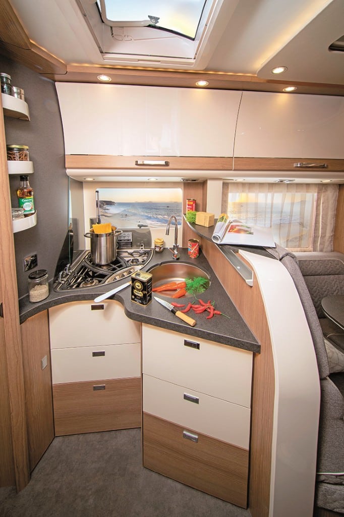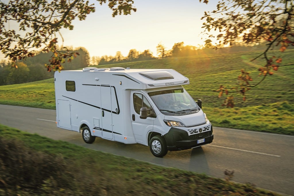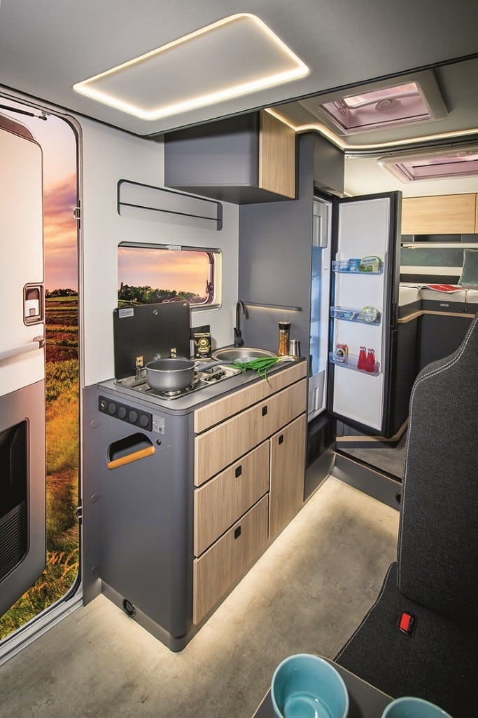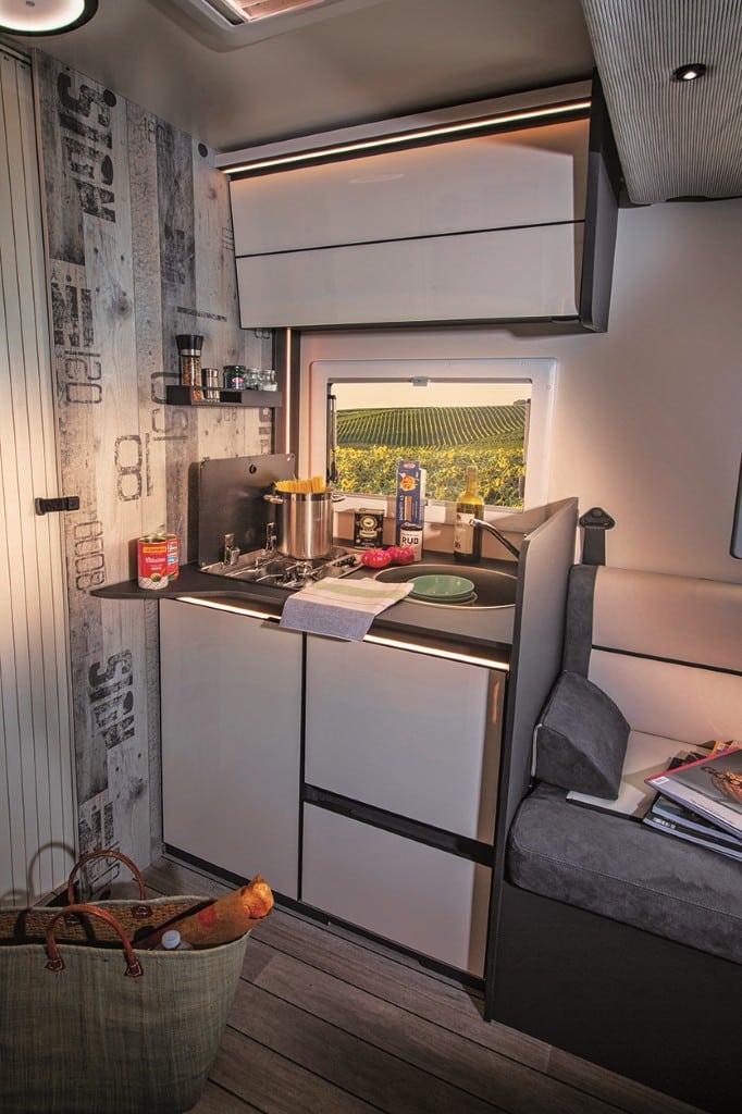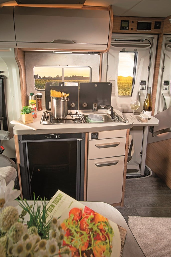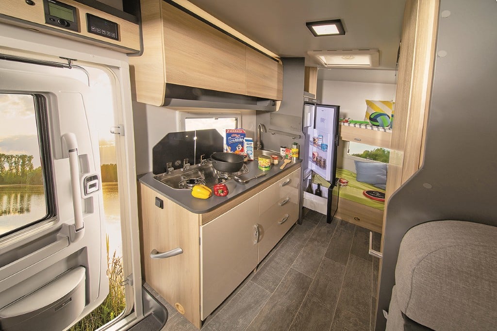 Familienfreundlich: Elektrisch absenkbares Hubbett, L- und Längsbank – Umbau zu Einzelsitzen auf Tour möglich, Querheckbett, große Küche und Bad mit separater Dusche bieten Platz für fünf Camper. Der Abwassertank ist ab Werk isoliert und beheizt, die Serienausstattung der Basis (130 PS) mit Tempomat und Klimaautomatik sowie der Einrichtung mit 150 Liter-Kühlschrank, Weinregal und Diesel-Heizung ist umfangreich. Für die Fahrt mit vier und fünf Passagieren empfiehlt sich die Auflastung auf 4,1 Tonnen.