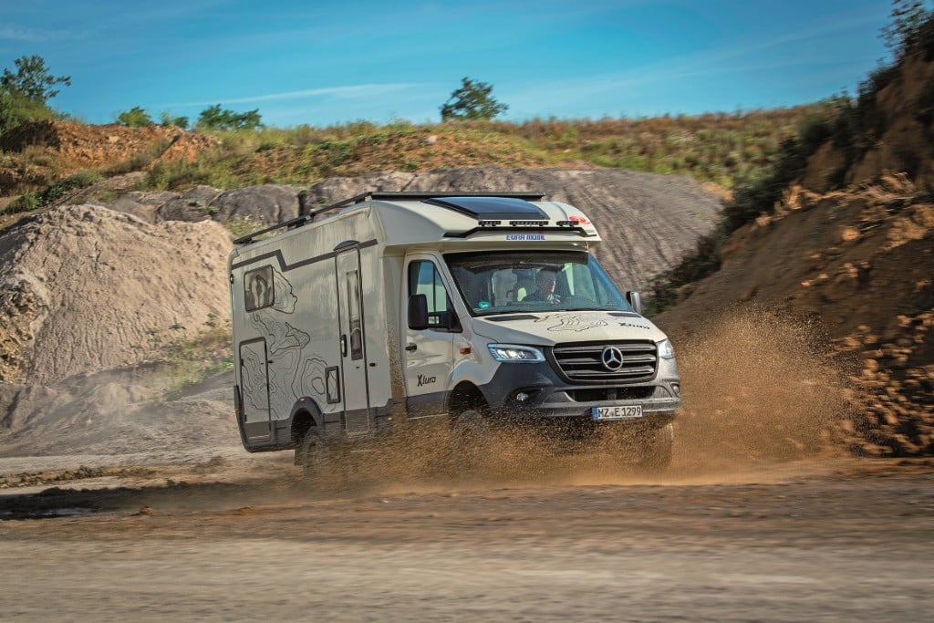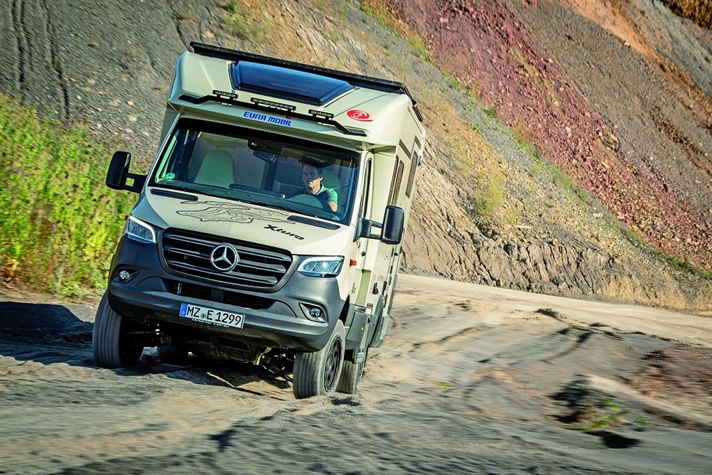 Mit Höherlegung, verstärkter Hinterachsfederung, Allradantrieb und auch mit groben Stollenreifen will der Xtura das sein, wovon abenteuerlustige Camper träumen – ein Fernreisemobil. Die Basis: Mercedes-Benz Sprinter mit originalem Leiterrahmenchassis und serienmäßig 190 PS sowie Neungang-Automatik 9G-Tronic. Zulässige Gesamtmasse des geländegängigen Teilintegrierten: 4.100 Kilogramm. Auf den verwindungssteiferen Leiterrahmen stellt Eura Mobil eine solide Rundum-GfK-Sandwichkabine mit wasserabweisender XPS-Isolierung in Boden und Dach sowie EPS (nicht wasserabweisend) in den Wänden. Rahmenfenster sind Serie. Der gemütlich anmutend eingerichtete Wohnraum ist mit solide gefertigten Möbeln bestückt.
