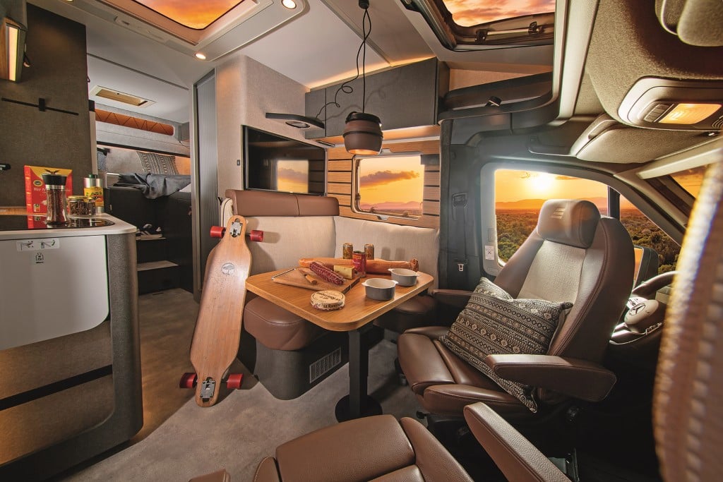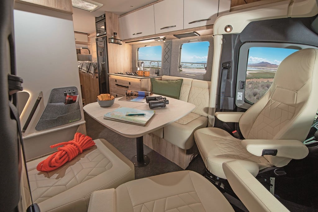 Der Aufbau: holzfrei, hochwertig und mit RTM-Schaum wasserabweisend isoliert. Rahmenfenster und das manuell absenkbare Hubbett vorn sind Serie. Die komfortable Sprinter-Basis auf Al-Ko-Tiefrahmen bietet zahlreiche Assistenzsysteme, der Möbelbau ist sehr solide und elegant zugleich. Im Doppelboden finden die Versorgungstanks frostsicher Platz, ebenso Gepäck über Ladeluken im Wohnraumboden.