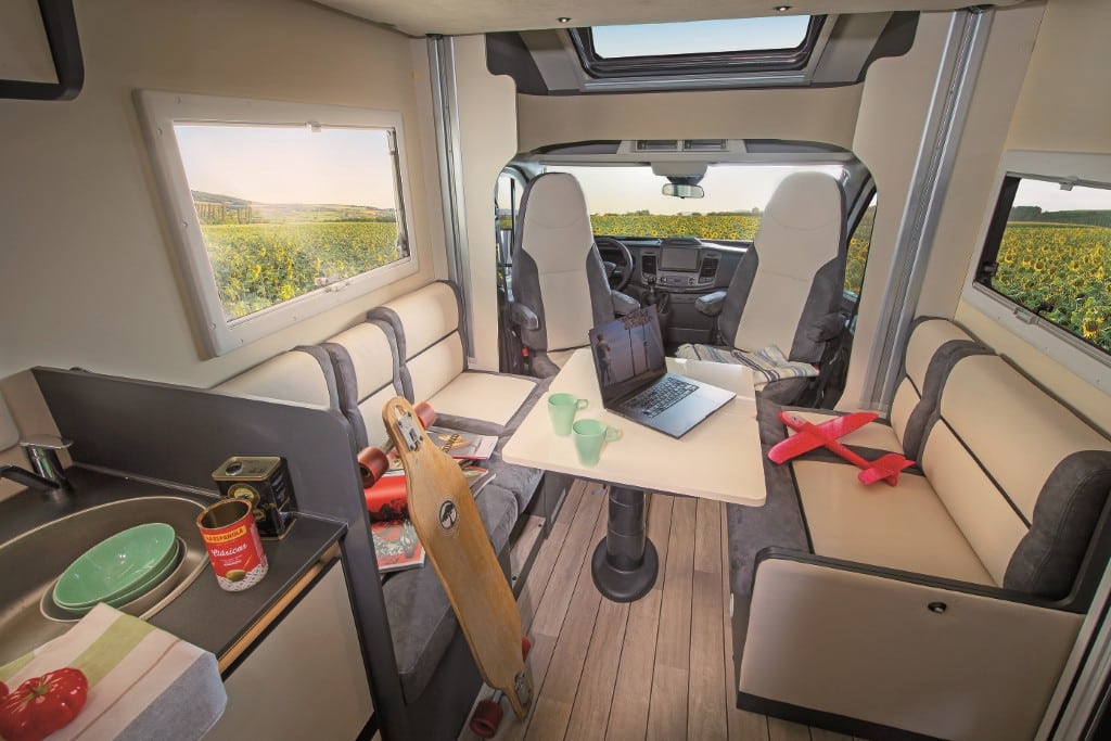 Auf einer Länge von 6,99 Metern realisiert Itineo aus Frankreich einen familienfreundlichen Grundriss in einem Teilintegrierten. Quer-Stockbetten im Heck, eine zum Doppelbett umbaubare L-Sitzbank mit Längsbank gegenüber sowie ein darüber montiertes elektrisch absenkbares Hubbett bieten der mobilen Familie sechs Schlafplätze. Aus der Sitzgruppe entstehen drei, optional (320 Euro) vier Sitzplätze mit Gurt für die Fahrt.