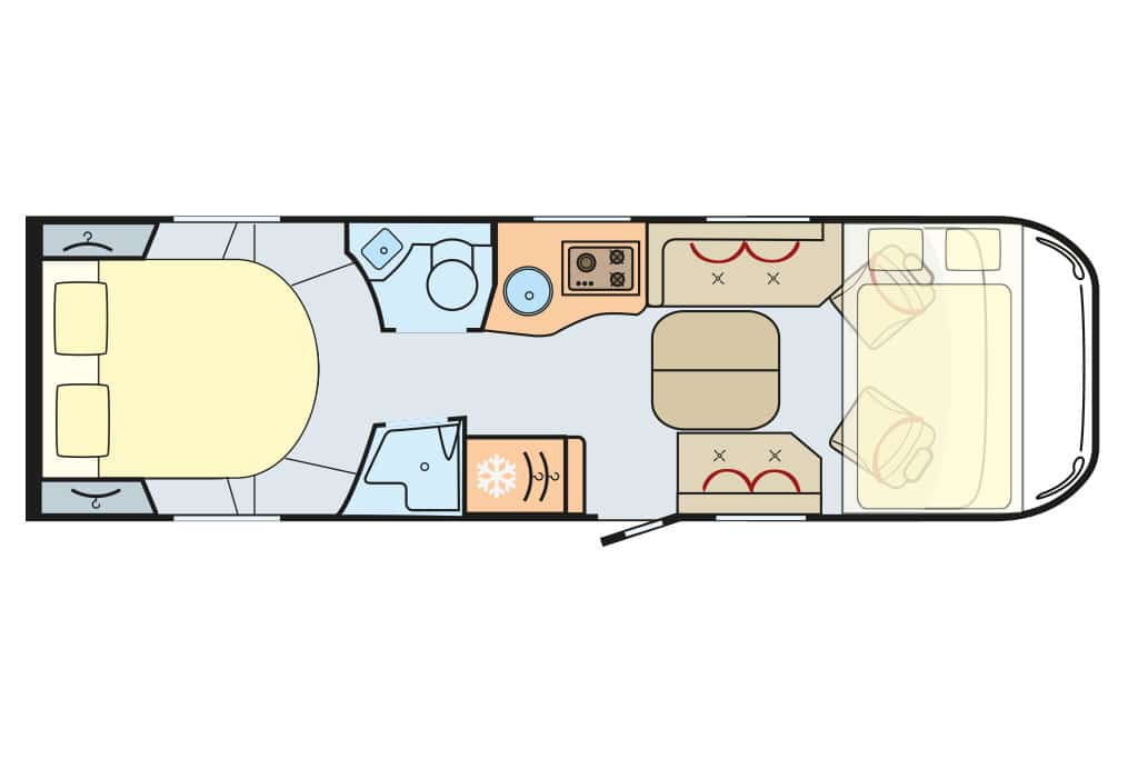 Grundrisse: der Baureihe: drei – mit Querbett, mit Einzelbetten oder mit Hubbett und großem Heckbad