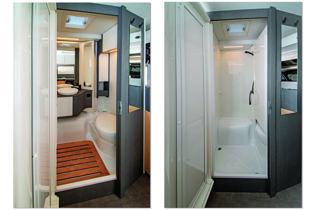Das variable Bad im Ahorn Camp T 690 ist ein guter Bekannter aus dem EHG-Regal. Zum Duschen schwenkt der Waschtisch samt Spiegel vor die Drehtoilette von Thetford. Sowohl beim Duschen als auch bei weggeklappter Dusche hat der Urlauber im Bad genügend Platz. Einziges Manko im Bad: die kleine Dachhaube.