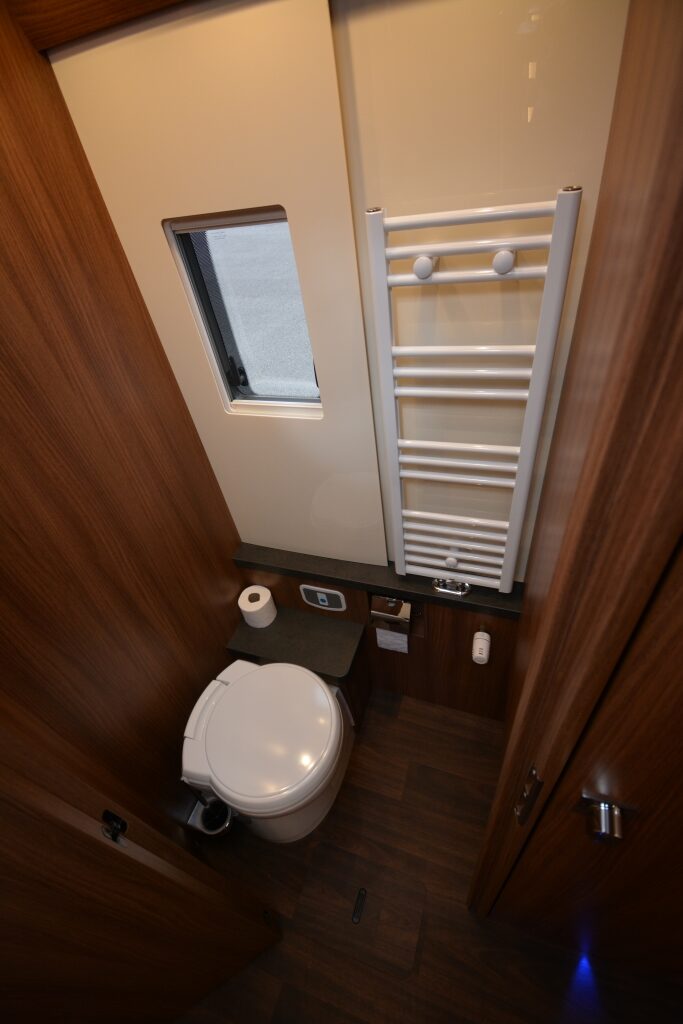 Das Badezimmer dahinter ist stattliche 155 Zentimeter lang und lässt sich sowohl zum vorderen Wagenteil wie zum Heckschlafzimmer hin mittels zweier hölzernen Schiebetüren zum Wohntrakt und zum Heckschlafzimmer hin abtrennen. Dank der großzügigen Abmessungen fungiert das Bad auch als Umkleidezimmer.