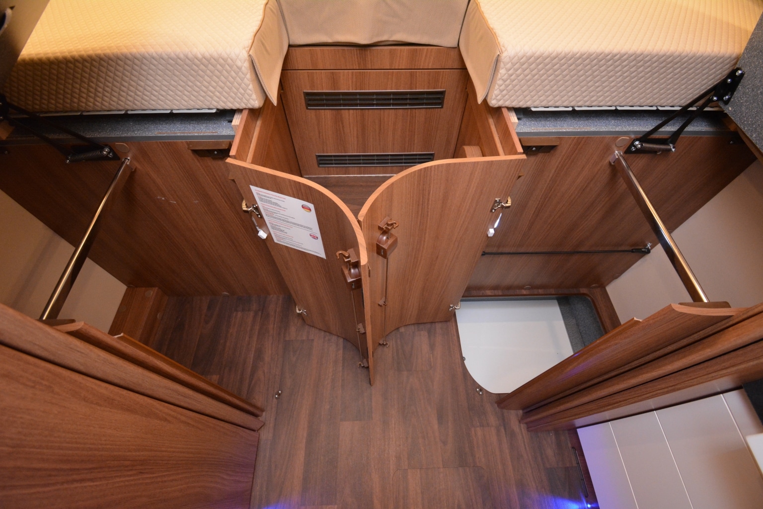 Hochgesetzte Einzelbetten (je 200 mal 85 Zentimeter), die sich zur Liegewiese zusammenlegen lassen, finden ihren Platz im Heckschlafzimmer des I 61 XL LE. Die Fußteile der Kunststoff-Lattenroste lassen sich praktischerweise aufstellen. Das erleichtert die Beladung der darunter verborgenen Kleider- und Wäscheschränke (jeweils 90 mal 80 mal 50 Zentimeter). Zwei weitere Schlafplätze bietet der Proband serienmäßig im Bug in Form eines großen manuell absenkbaren Hubbetts (195 mal 160 Zentimeter), das Carthago mit Lattenrost, Buchablage und LED-Spots bestückt.