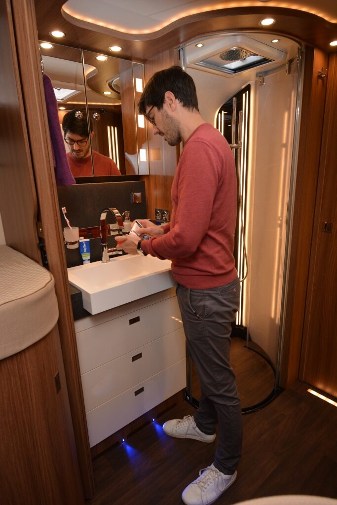 Carthago richtet es ein mit einem 85 mal 62 Zentimeter großen Toilettenraum inklusive Fenster für den Dunstabzug auf der Beifahrerseite. Gegenüber stehen die 85 mal 75 Zentimeter große Duschkabine mit zwei Wasserabläufen und Dachluke, daneben ein großer Waschtisch in Haushaltsdimensionen. Zudem integriert Carthago einen mannshohen, 175 mal 62 mal 50 Zentimeter großen Kleiderschrank in den Badezimmertrakt. Dementsprechend hoch ist der Sanitärkomfort des großen Integrierten.