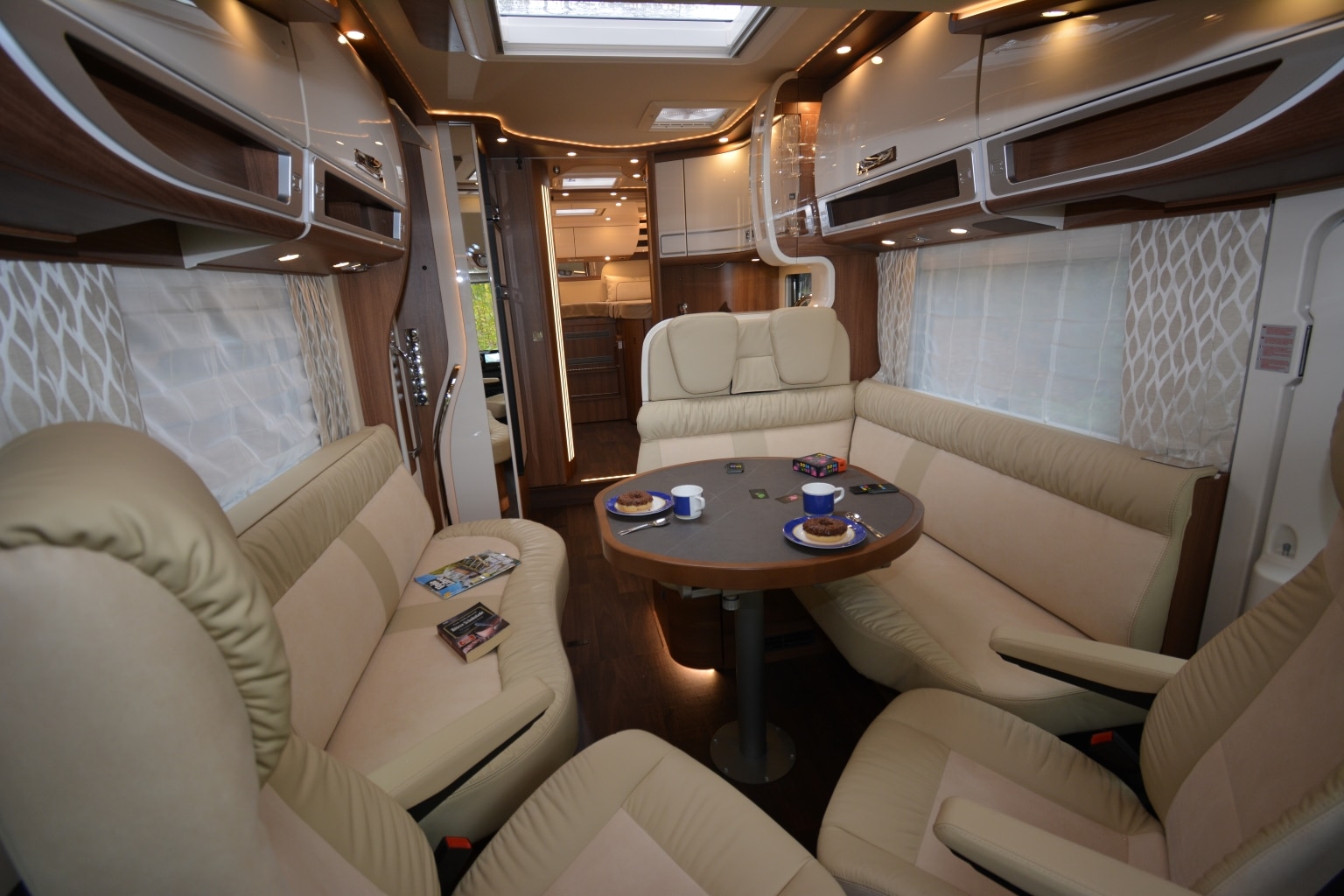Die großzügig geschnittene Einrichtung gliedert sich in vier verschiedene Wohnbereiche. Im vorderen Teil sieht Carthago ein großes Wohnzimmer vor mit großzügig dimensionierter und sehr bequemer L-Sitzbank sowie gegenüber positionierter Längscouch (138 Zentimeter lang) inklusive Mehrlagen-Schaumkern-Sitzpolster mit Rückenstützfunktion und Ausziehfunktion. Die in alle Richtungen verschiebbare Tischplatte ist mit 81 mal 81 Zentimetern ordentlich dimensioniert und lässt sich zusätzlich um 21 Zentimeter verbreitern, damit bis zu sechs Camper bequem Platz an der Tafel finden.