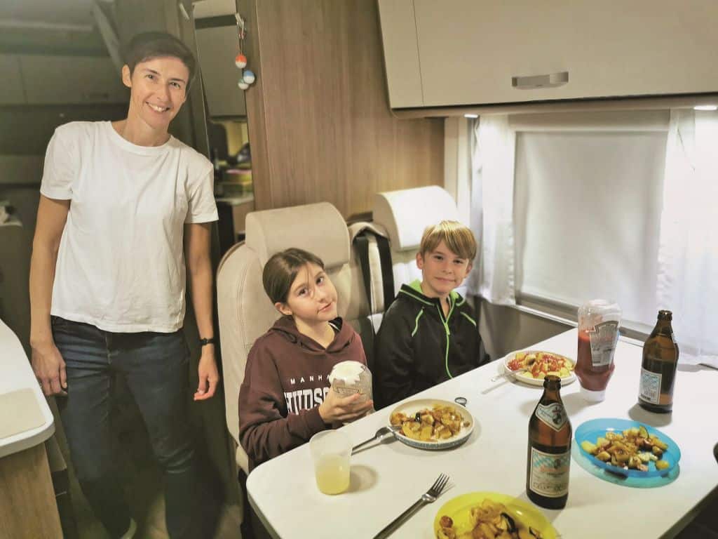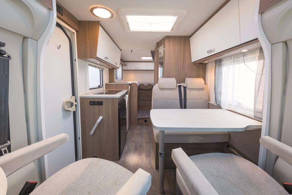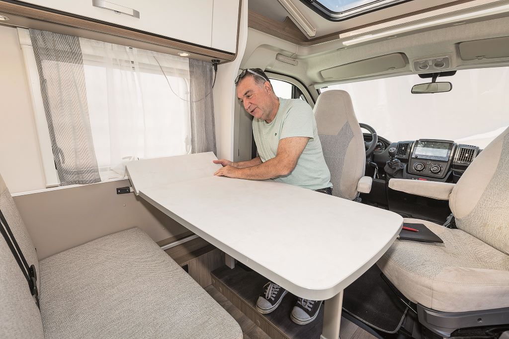 Und es zeigt sich: Im Carado V337 pro sind alle Dinge des Camping-Alltags möglich, und das durchaus komfortabel: Schlafen, Kochen, Duschen oder gemütlich an der Sitzgruppe Platz nehmen – der Zweiercrew, auf die das Mobil ausgelegt ist, fehlt es dabei an nichts Wesentlichem. Zusätzliche Schlafplätze für Gäste kann der Teilintegrierte allerdings nicht bieten. Für die Fahrt kommen zwei Mitfahrer aber auf der Sitzbank der Halbdinette unter, die dafür mit zwei Dreipunktgurten ausgestattet ist.