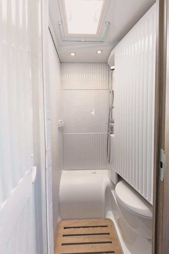 Ausgereift und nach wie vor clever: das in vielen Fahrzeugen aus der Hymer-Gruppe verbaute Schwenkbad. Die Waschtischwand klappt mit einem Handgriff um 90 Grad zur Seite über die Toilette und es entsteht eine ausreichend große Duschkabine. So wird der Raum im kompakten Fahrzeug sinnvoll doppelt genutzt – auch wenn nach dem Duschen zwangsweise das gesamte Bad nass ist. Gut: die Duschwanne verfügt über zwei Abläufe.