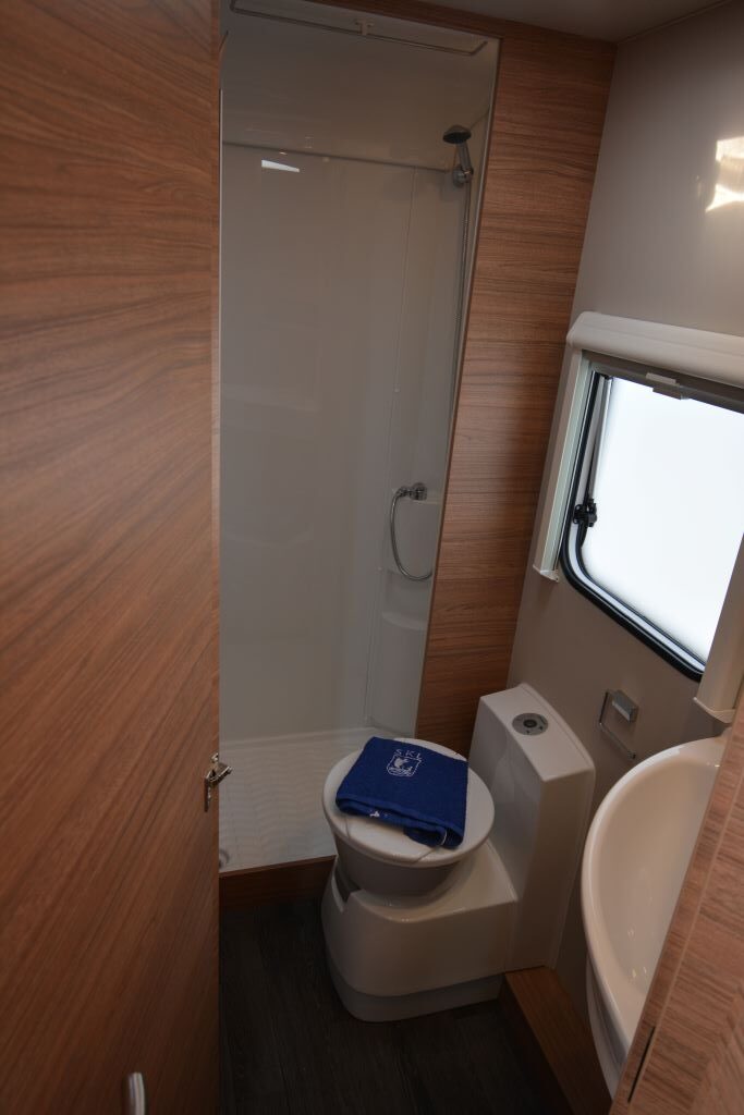 Toll ist die separate Duschkabine im hinteren Bereich des Bades – hier stört kein Radkasten. Auch im Bad davor gibt’s genug Platz und die Kassettentoilette punktet mit einer leicht zu reinigenden Keramikschüssel. Der Schrank über dem Waschbecken behindert aber den Zugang zu selbigem – etwa, um sich das Gesicht zu waschen.