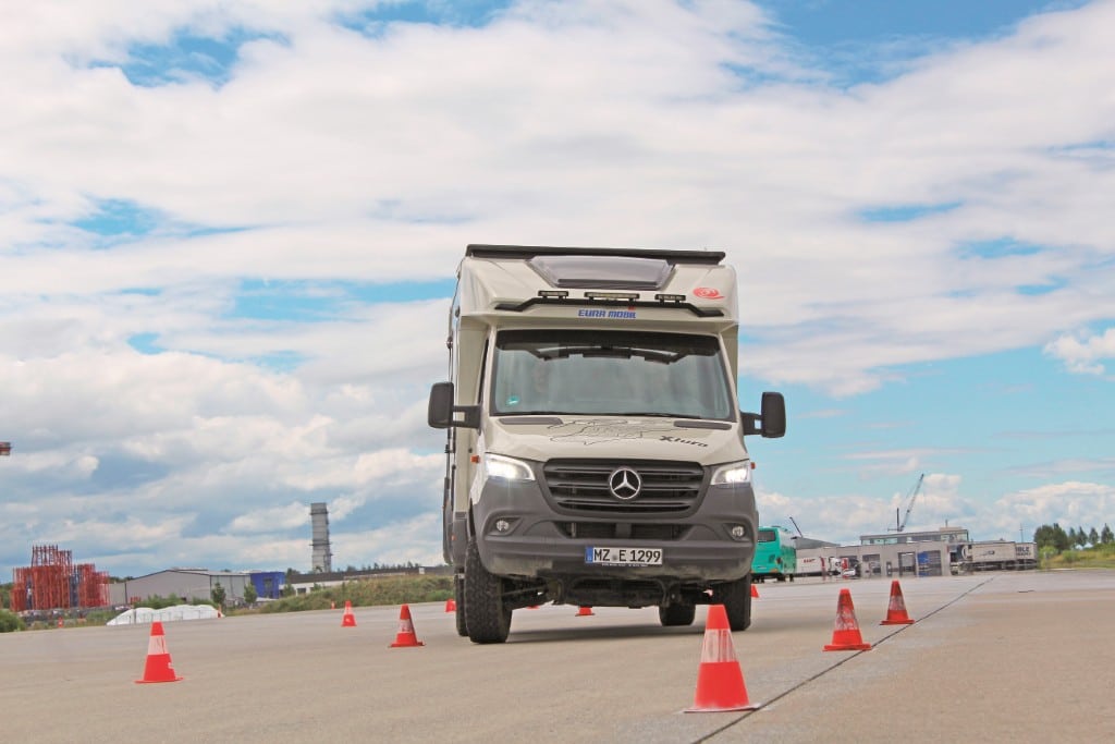 Der Eura Mobil Xtura XT 686 EF auf Mercedes-Benz Sprinter tritt den Fahrtest mit originalem Leiterrahmenchassis mit 4×4-Antrieb und verstärkter, drei Zentimeter erhöhter Hinterachse an. Den doppelten Fahrspurwechsel absolviert das Allrad-Mobil mit 55 km/h, den 18-Meter-Slalom in 14,1 Sekunden. Somit schneidet der 4,1-Tonner aus Sprendlingen in beiden Disziplinen besser ab als der Durchschnitt. Im Grenzbereich neigt das gesamte Fahrzeug zum Schieben. Grund hierfür ist der Allradantrieb. Zudem taucht die Vorderachse vergleichsweise tief ein. Das ESP-System greift hier aber sofort helfend ein, und so bleibt der Eura Mobil Xtura XT 686 EF gut beherrschbar.