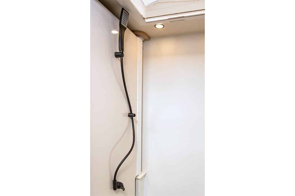Das Bad ist mit einer Banktoilette und einem großen Waschbecken an einer Spiegelwand ausgestattet. Schwenkt man diese um 90 Grad vor das WC, entsteht eine geräumige Duschkabine. Die beiden Duschtüren aus undurchsichtigem Glas trennen zugleich das gesamte Bad ab. Sie bleiben während der Fahrt zuverlässig geschlossen. Wasser und Schaum verlassen die Dusche durch zwei vertiefte Abläufe. So lässt das Bad kaum Wünsche offen.