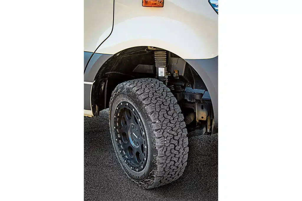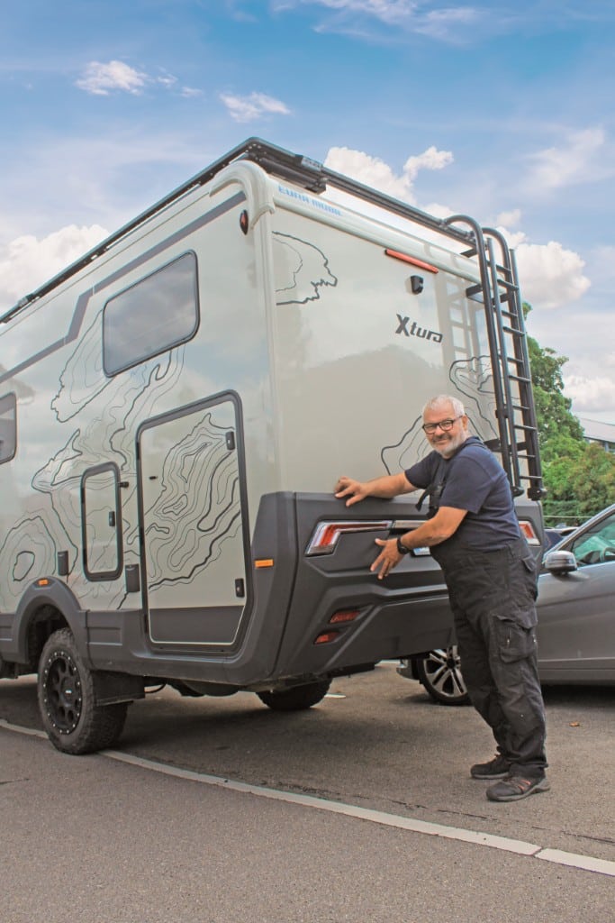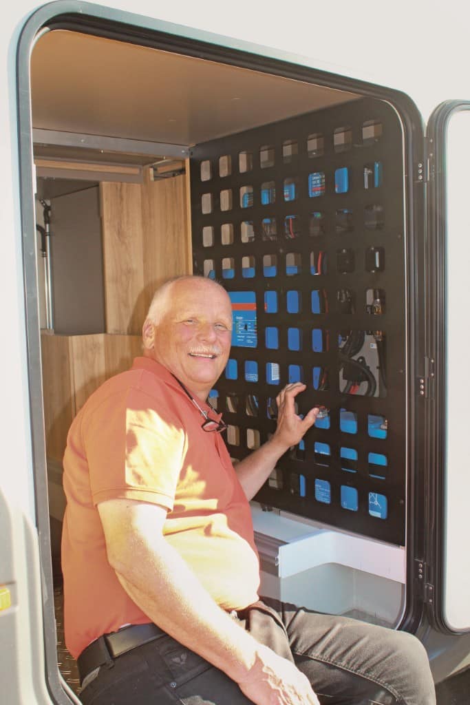 In der Heckgarage, hinter einem Metallgitter gut geschützt, befindet sich die hochwertige Elektrik mit Ladegerät samt Wechselrichter, Solarreglern und 300-Ah-LiFePo4-Akku von Victron. Das System soll das Fahrzeug unter optimalen Bedingungen und bei sparsamster Nutzung laut Hersteller bis zu 30 Tage elektrisch autark machen. Hierfür ist das begehbare Dach mit zwei optionalen Solarpaneelen sowie mit Dachreling und Klappleiter am Heck ausgestattet. Alle diese Anbauteile an der Heckwand und auf dem Dach sind solide befestigt und ebenso vertrauenerweckend wie der gesamte Aufbau.