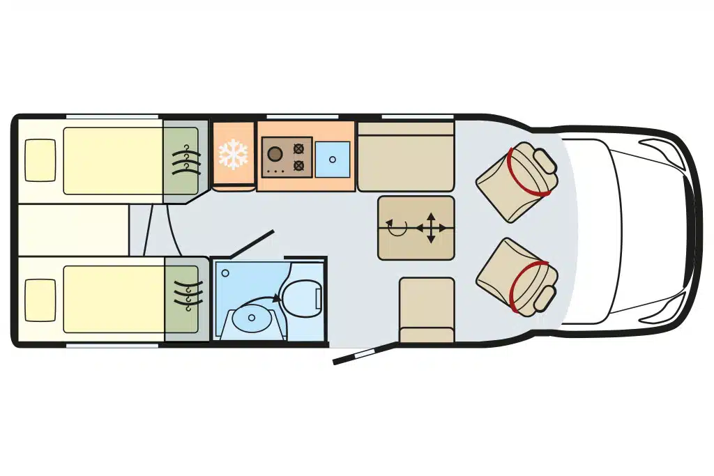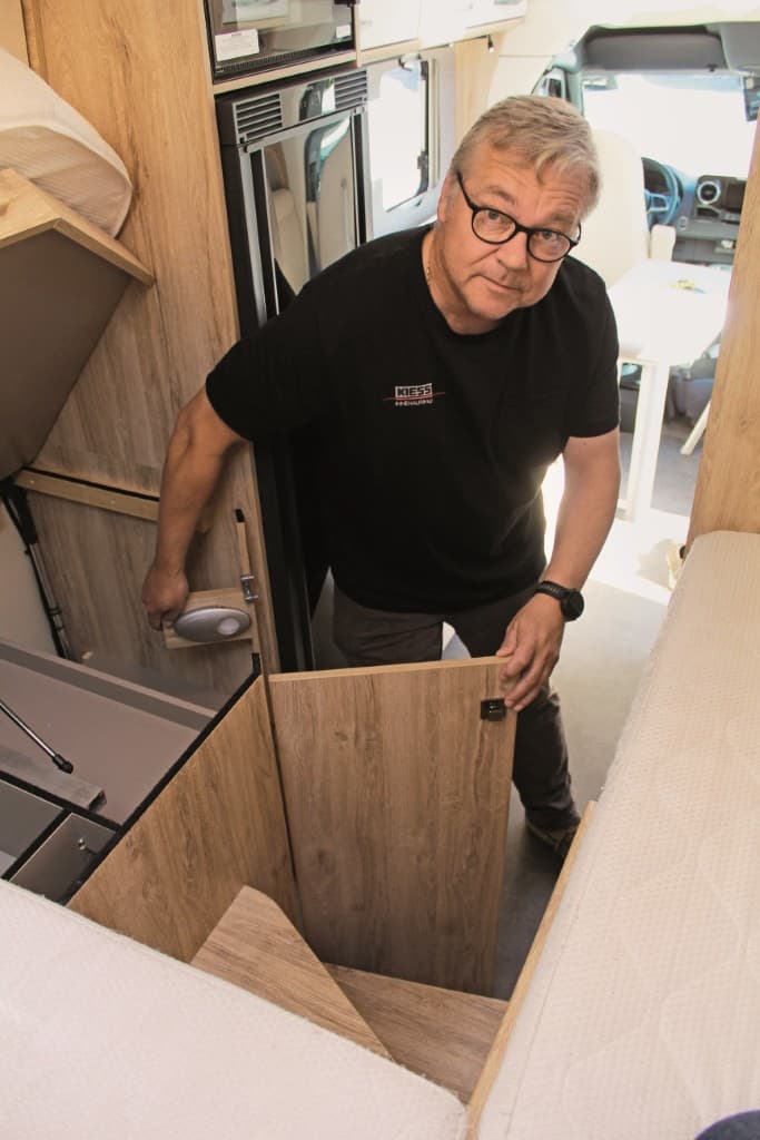 Die beiden Einzelbetten mit bequemen Matratzen lassen sich serienmäßig zum Doppelbett erweitern. Klappt der Camper ihre Holzlattenroste auf, gelangt er zu den Kleiderschränken, aber auch an die Heckgarage. Dass sich das Schlafzimmer nach vorn weder mit einer Tür noch mit einem Vorhang abtrennen lässt, mag für zwei Reisende, die ohnehin nebeneinander liegen, in Ordnung gehen.