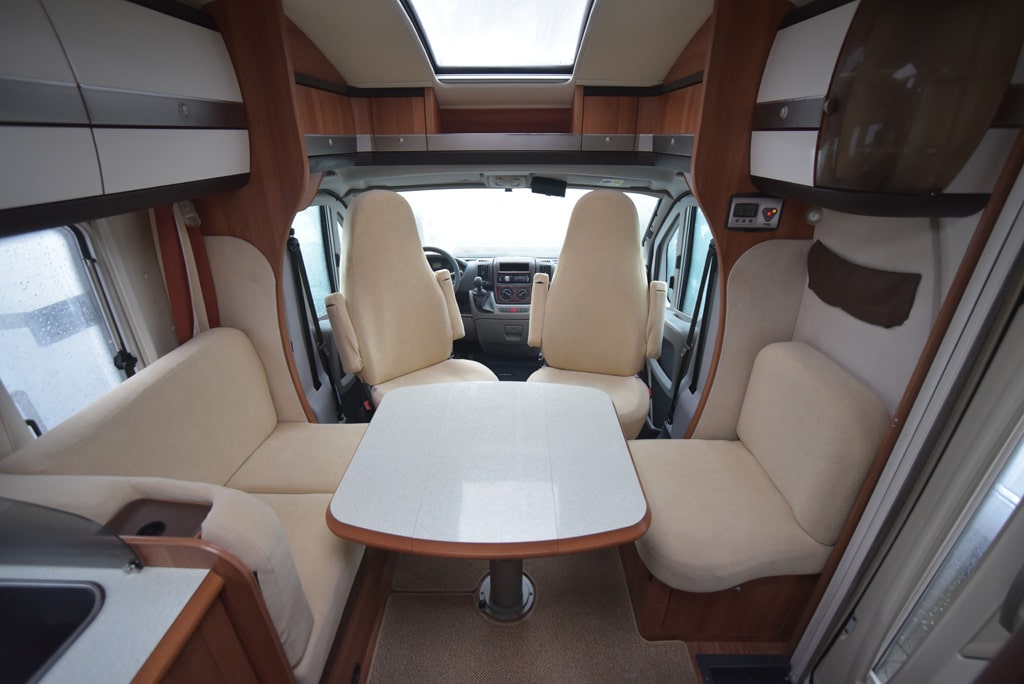 Auffallend am TI 640 ist das gute Raumgefühl. Die vielen Fenster auf der linken Seite lassen viel Licht ins Innere. Mit zwei gegenüberstehenden Sitzbänken und drehbaren Vordersitzen war Fendt seiner Zeit voraus und präsentierte schon seinerzeit die derzeit topaktuelle Vis-à-vis-Einteilung im Wohnbereich. Der höhenverstellbare und frei verschiebbare Ein-Säulen-Tisch ermöglicht jederzeit den freien Zugang zum Fahrerhaus. Zudem lässt sich die Tischplatte auf rund ein Drittel ihrer Größe zusammenklappen. Ist der Tisch abgesenkt, lässt sich in der Sitzgruppe der dritte Schlafplatz bauen.