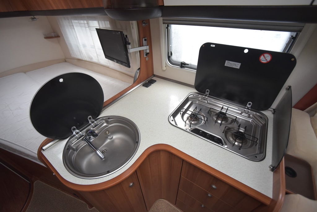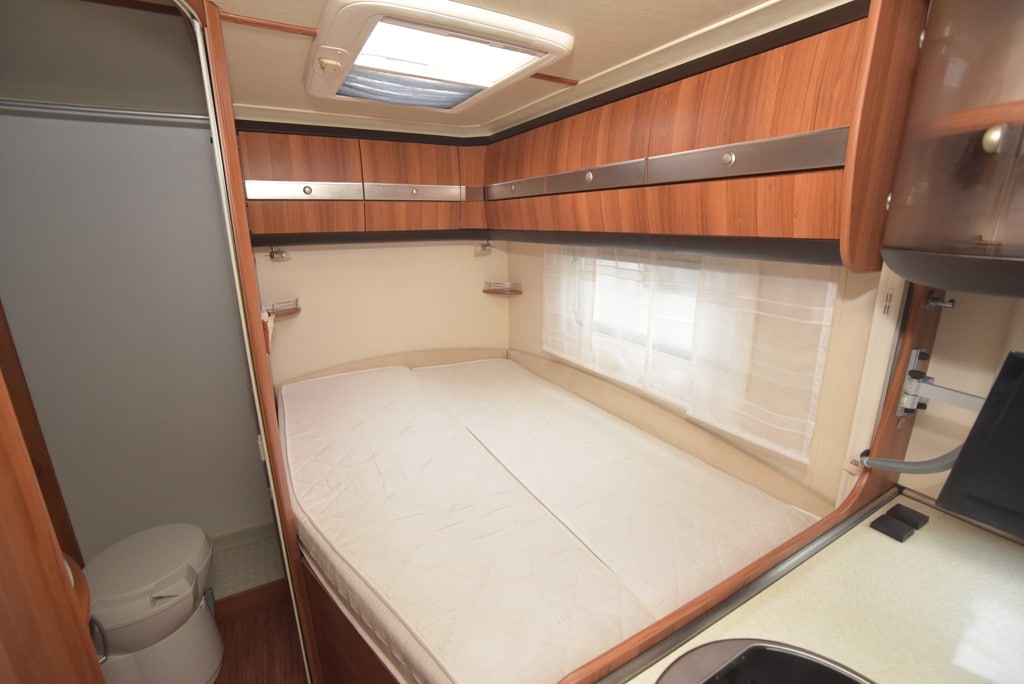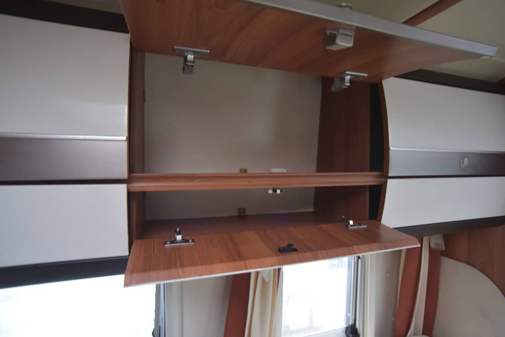 Ungewöhnlich, aber praktisch sind die geteilten Klappen der Hängeschränke, die zwei getrennte Schrankfächer verbergen. Alle Klappen funktionieren dank Metallscharniere fehlerfrei. Abgesehen von einer kleinen und bereits reparierten Macke in der Tischplatte, präsentiert sich der Wohnteil in perfektem Zustand. Selbst die hellen Polster geben keinen Anlass zur Beanstandung.