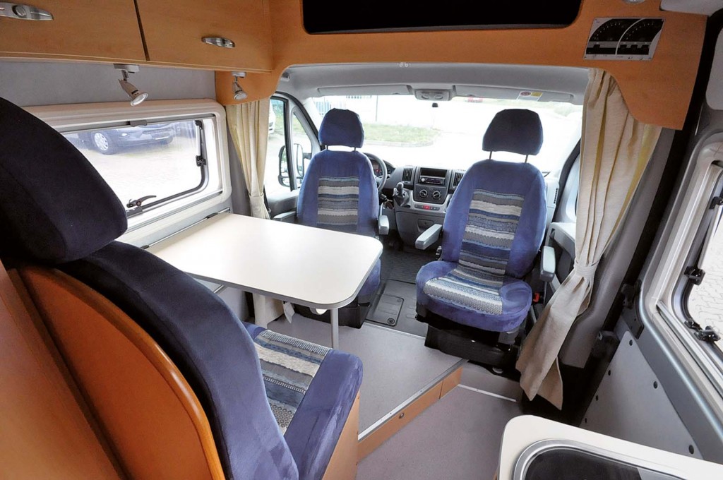 Trotz eines Alters von fünfeinhalb Jahren ist der Möbelbau tadellos. Hier macht sich die hochwertige Handarbeit der Obermeitinger Manufaktur bemerkbar. Der Marino kommt ohne Designextras aus. Der Wohnbereich besteht klassentypisch aus einer Halbdinette und zwei drehbaren Vordersitzen. Der doppelte Boden in der Sitzgruppe verhindert im Winter kalte Füße, und er bietet dank großer Schublade viel Stauraum.