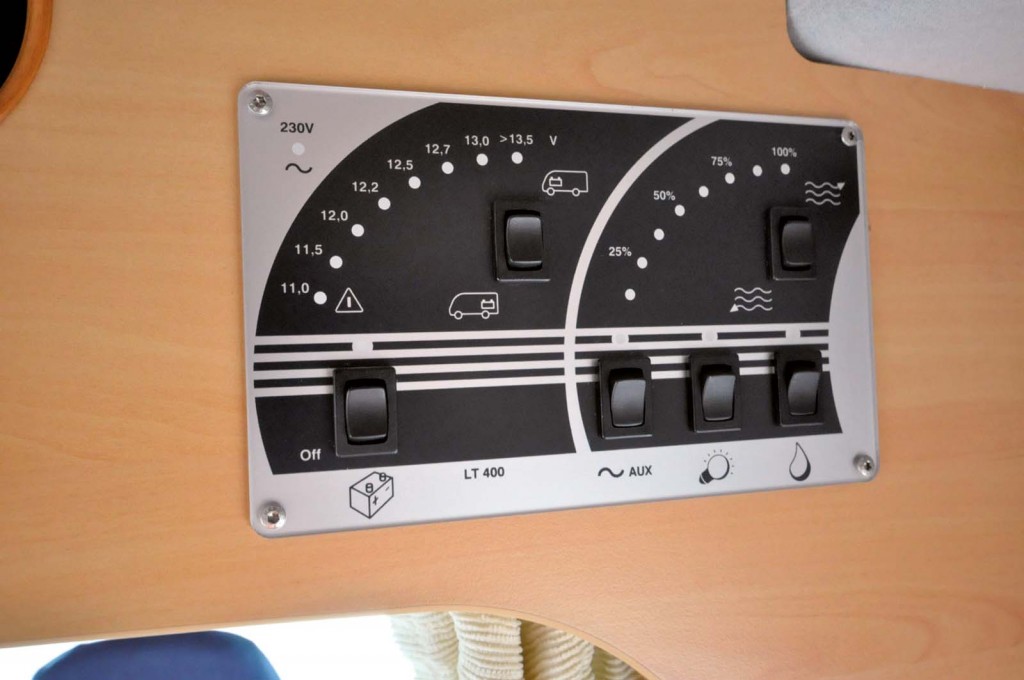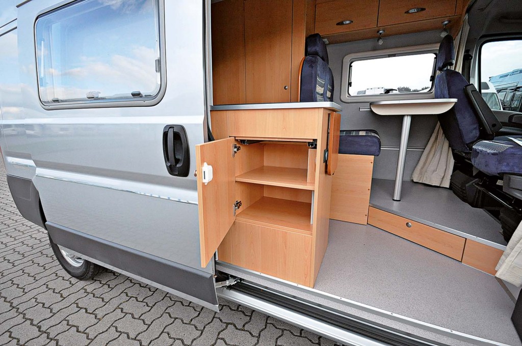 Die Unterkante des Betts ist nur etwas höher als eine Elf-Kilogramm-Gasflasche, was den Einstieg deutlich erleichtert. Dadurch fällt der Gepäckraum etwas kleiner aus. Wer mehr Platz braucht, klappt zum Transport einfach das Bett hoch. Die Matratzen sind wie der Möbelbau hochwertig und sauber. Positiv fällt die große Klappe auf, die den Wohnraum von der Garage trennt, aber einen Zugriff auf den Stauraum gestattet.