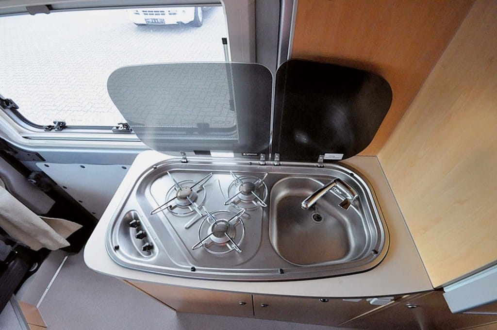 Der Kompressorkühlschrank kühlt auch bei hoher Außentemperatur gut. Pfiffiges Detail: Der Küchenschrank sitzt unter dem Herd und lässt sich auch von außen öffnen. Alles funktioniert tadellos, ist tipptopp sauber und hygienisch einwandfrei.